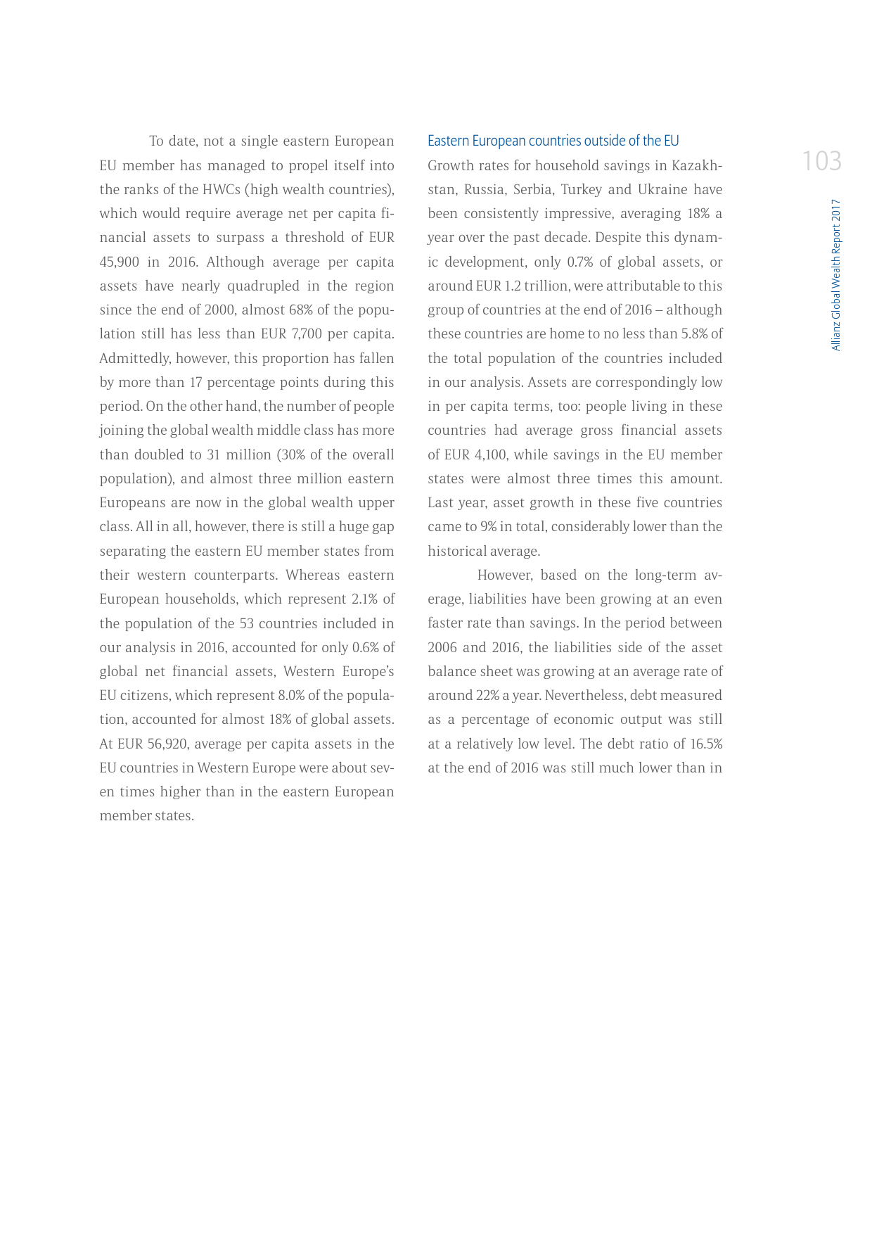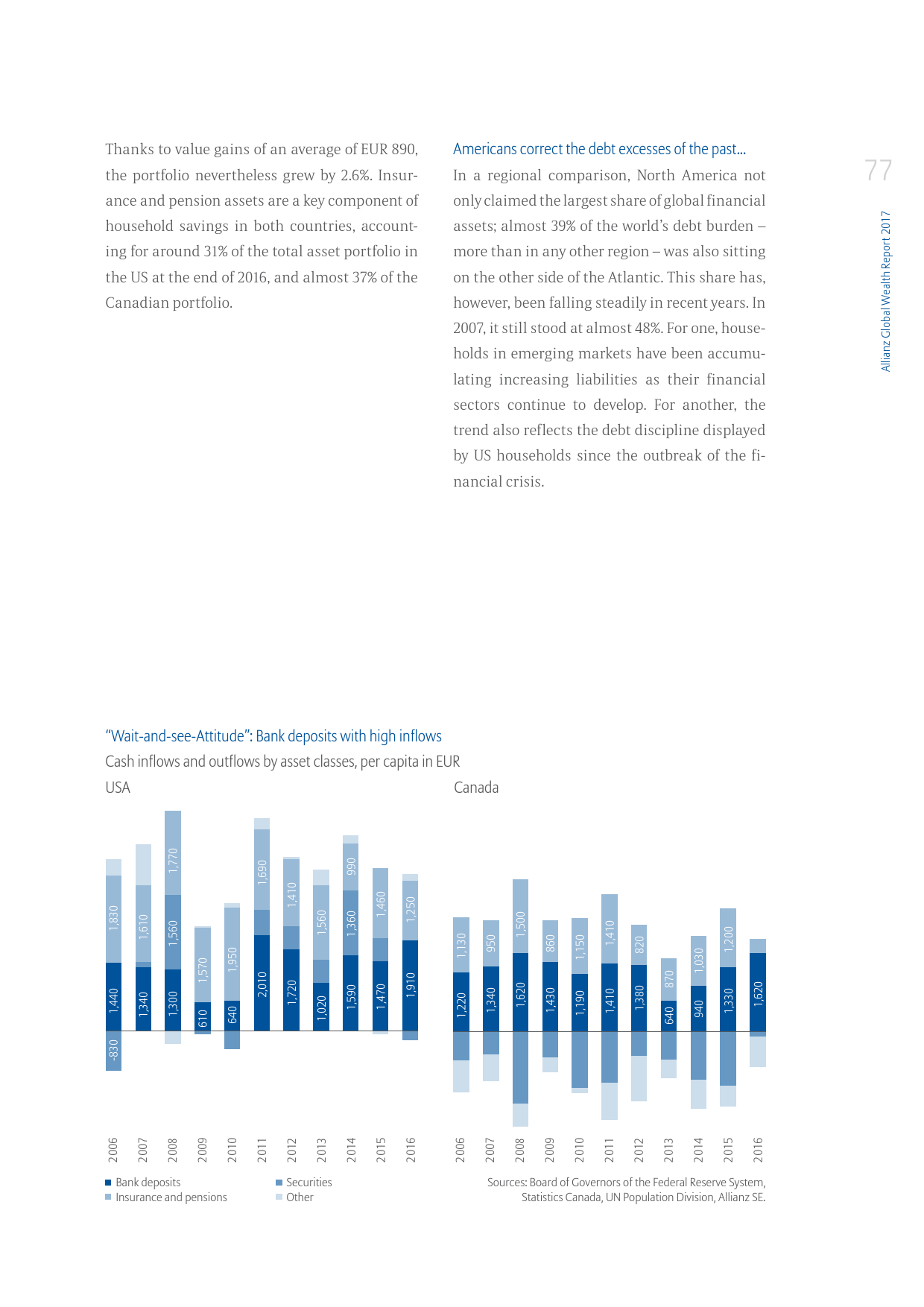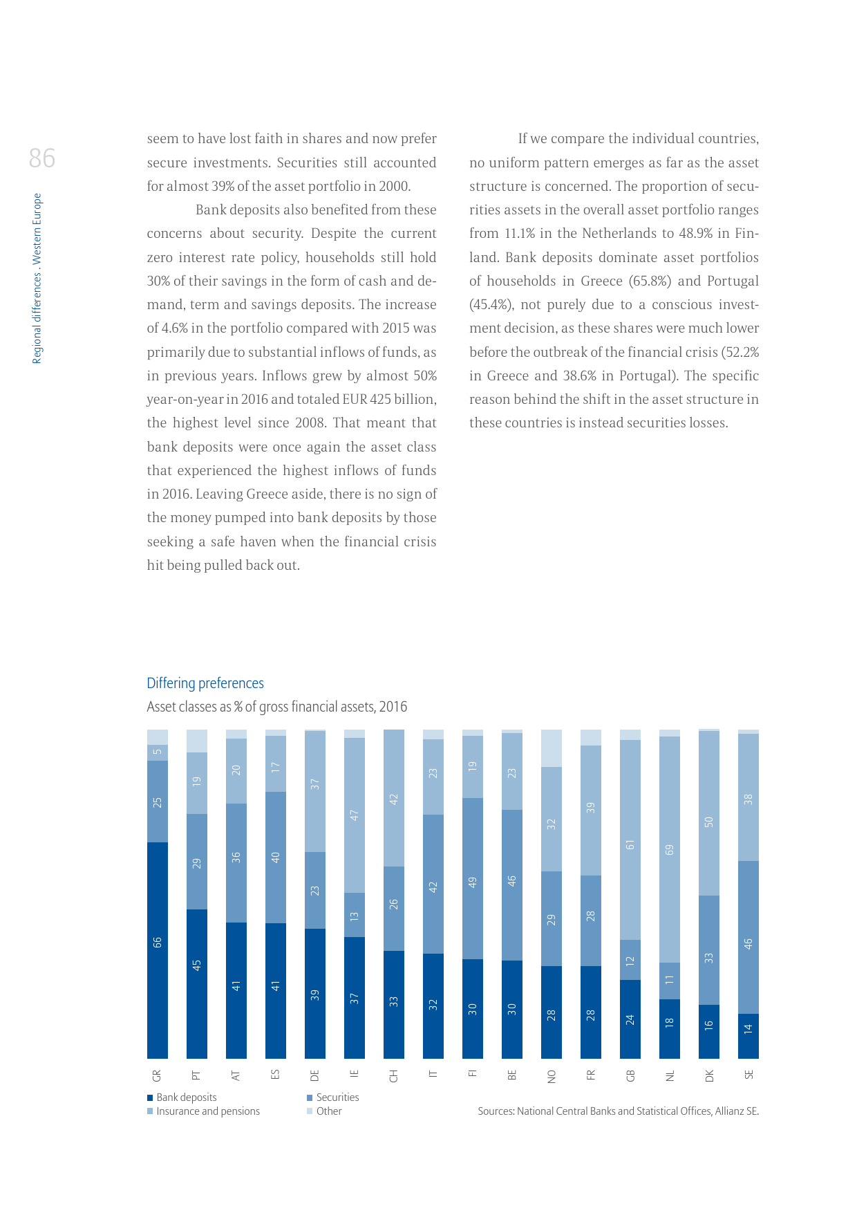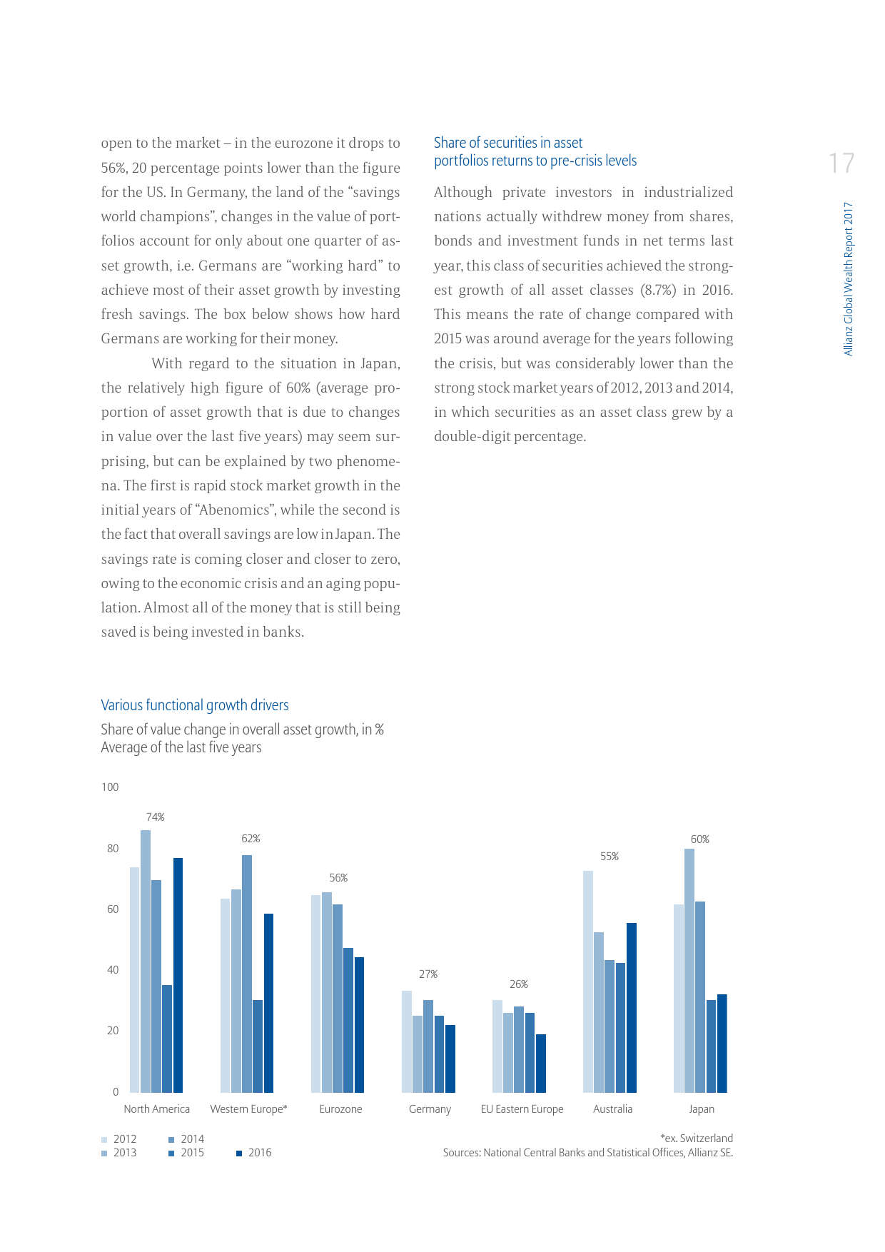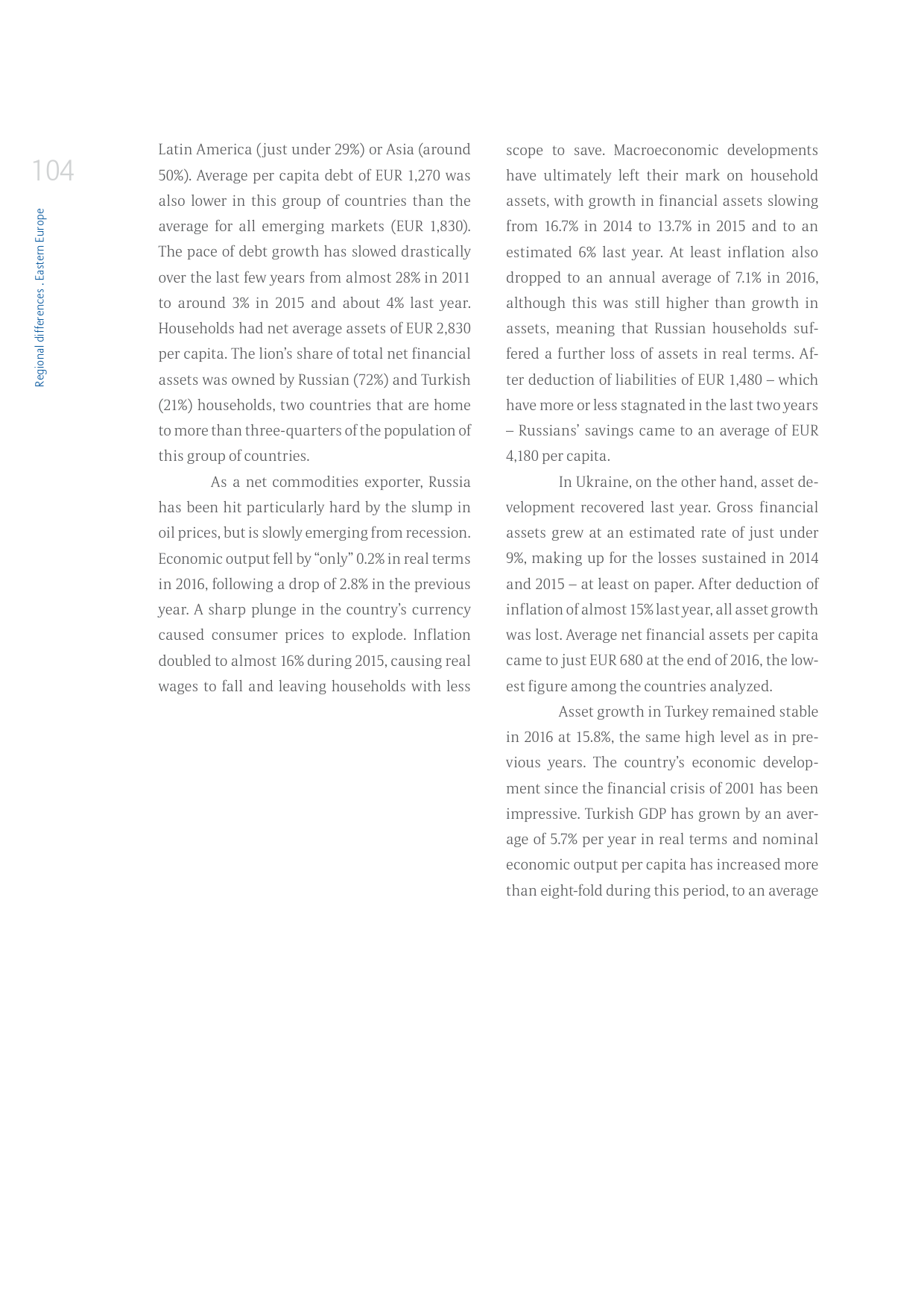 2016年,中国大陆人均金融资产净值为12765欧元,全球排名从2000年的第40位上升至第27位。日本、台湾和新加坡均跻身前20,其中台湾为92360欧元,全球排名第5位。排名第一的是美国,人均金融资产净值为177210欧元。之后为瑞士(175720欧元)、日本(96890欧元)、瑞典(95050欧元)。德国排名第18位(48760欧元)。