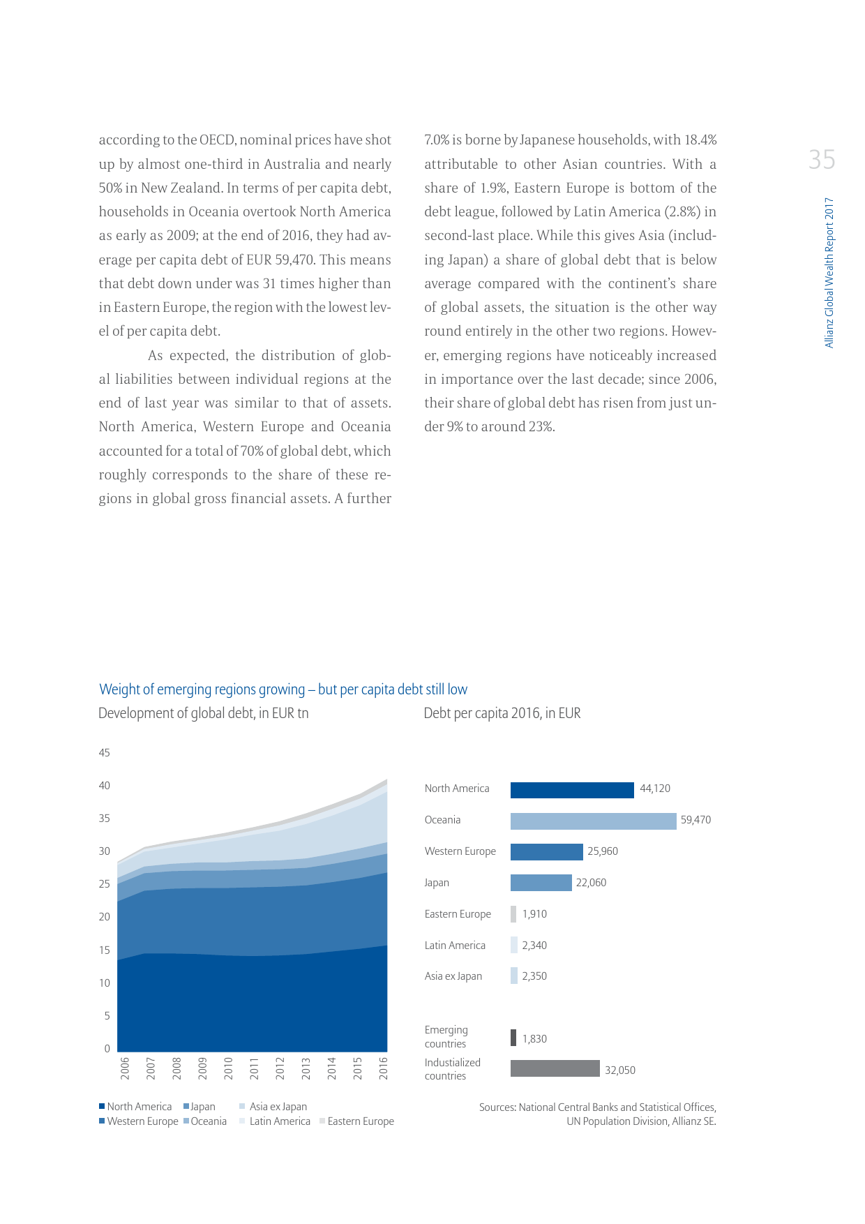 过去10年里,新兴国家的财富增长速度是发达国家的四倍。不过,尽管北美和西欧在全球财富中所占比例比2006年减少9%,但从去年的数据来看,北美和西欧仍占全球总财富的三分之二强,其中北美就占45%。如果再算上日本和澳大利亚,全球财富的四分之三都集中在这些富裕国家,而其人口总和只占世界人口的19%。