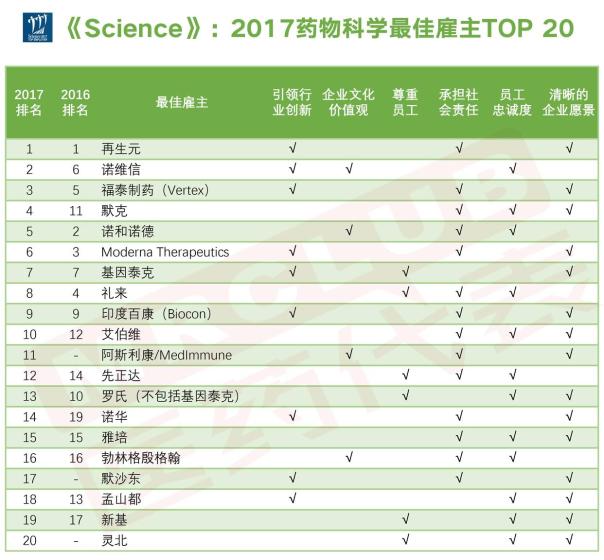 《科学》(Science)杂志自2012年以来,已经进行了15年的针对生物技术和制药行业全球最佳雇主评选,近日Science 公布了2017年度最佳雇主 TOP 20 名单,包括:再生元、诺维信、福泰制药、默克、诺和诺德、Moderna Therapeutics、基因泰克、礼来、印度百康、艾伯维、阿斯利康/MedImmune、先正达、罗氏(不包括基因泰克)、诺华、雅培、勃林格殷格翰、默沙东、孟山都、新基、灵北。