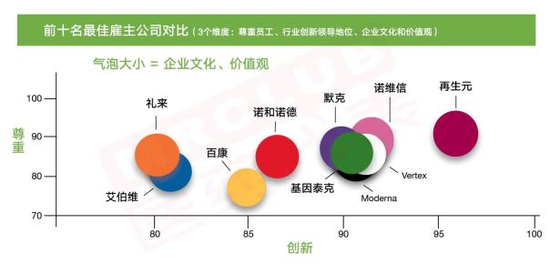 下图是前十名公司从三个维度进行的比较,竖坐标代表尊重员工程度,横坐标代表行业创新领导地位,气泡大小代表企业文化、价值观。