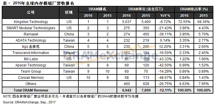 DRAMeXchange统计,2016年全球前五大内存模组厂已占整体销售额87%,前十名囊括全球模组市场中93%的营业额,大者恒大已是模组厂的趋势。