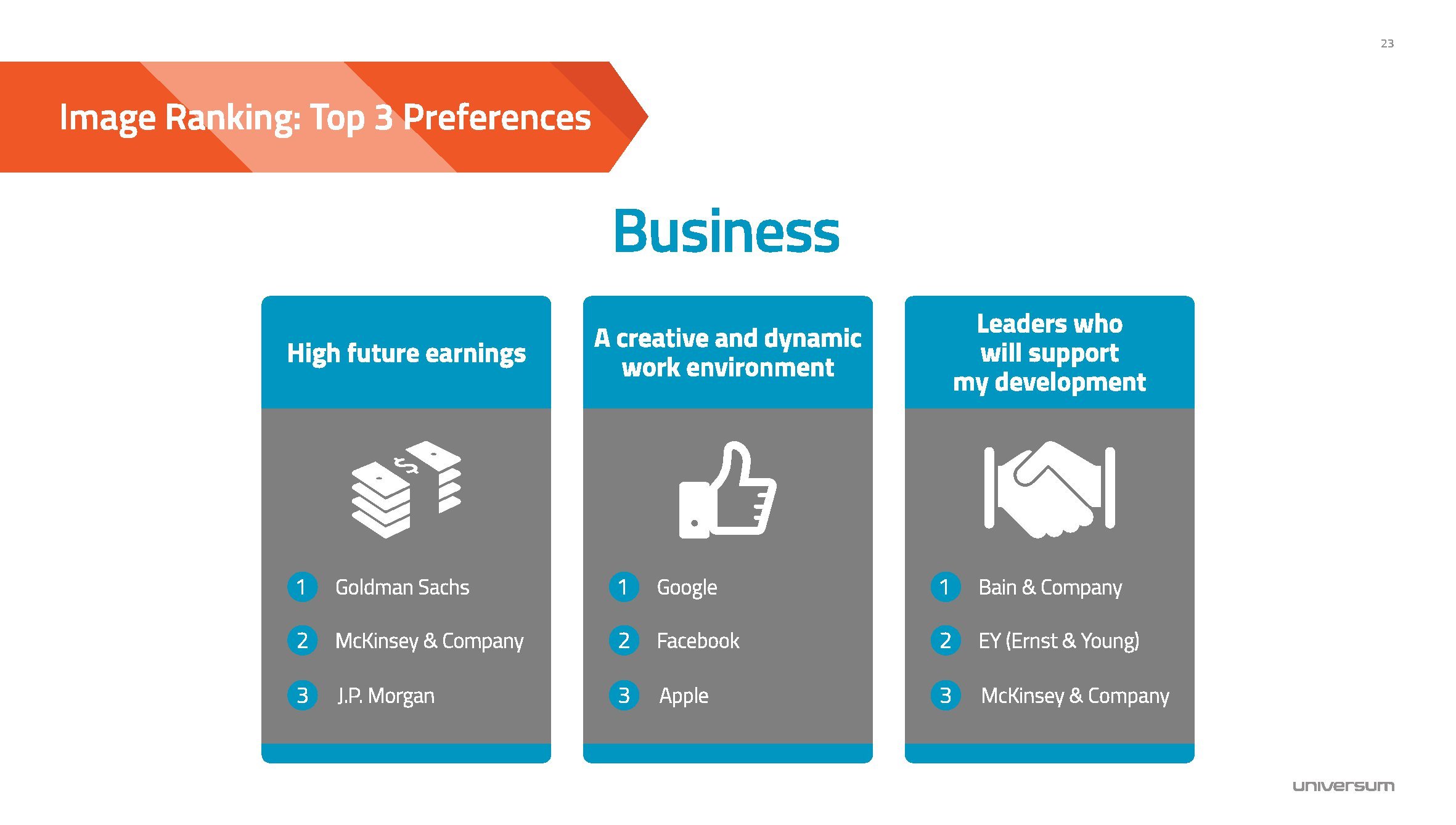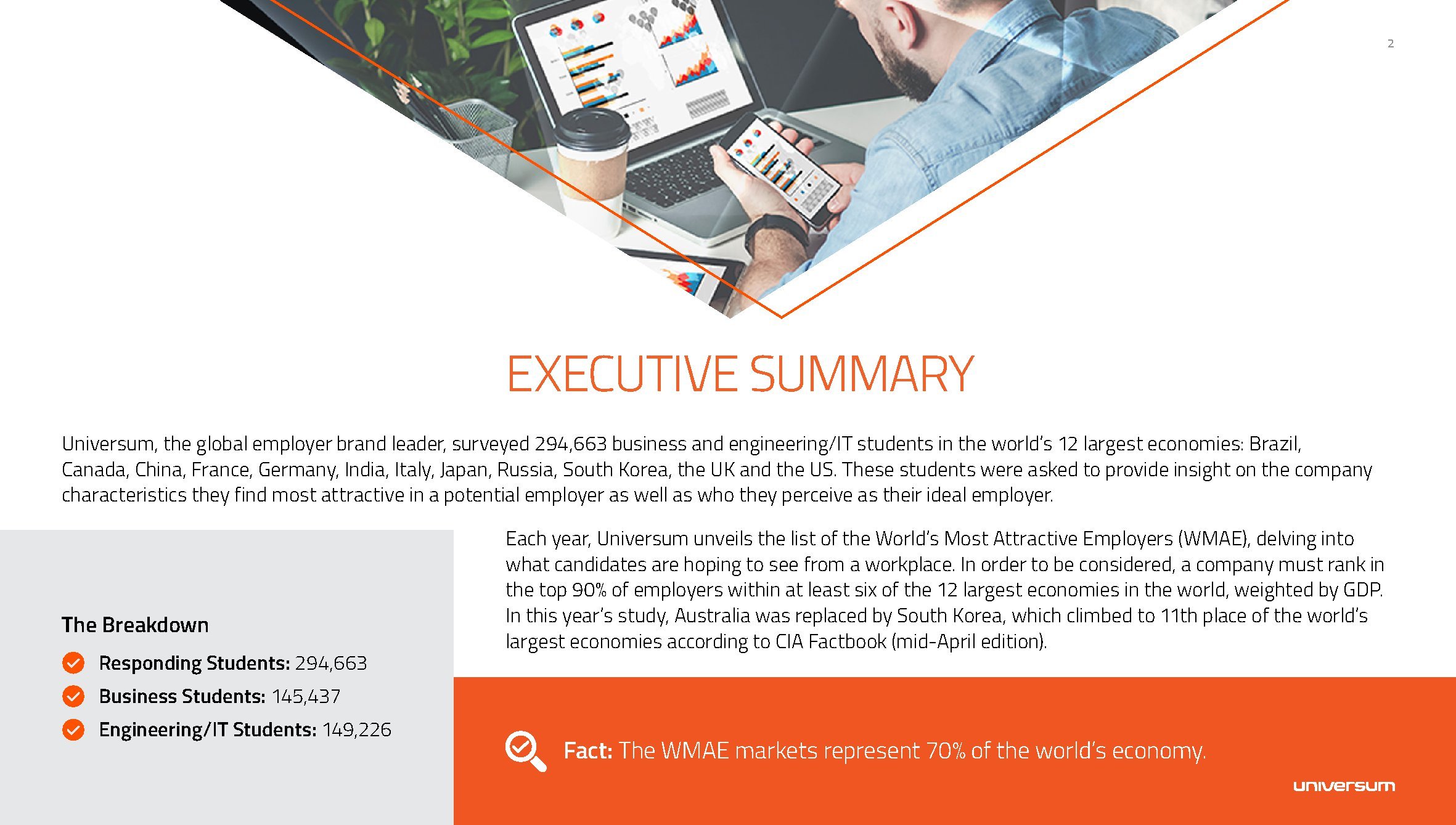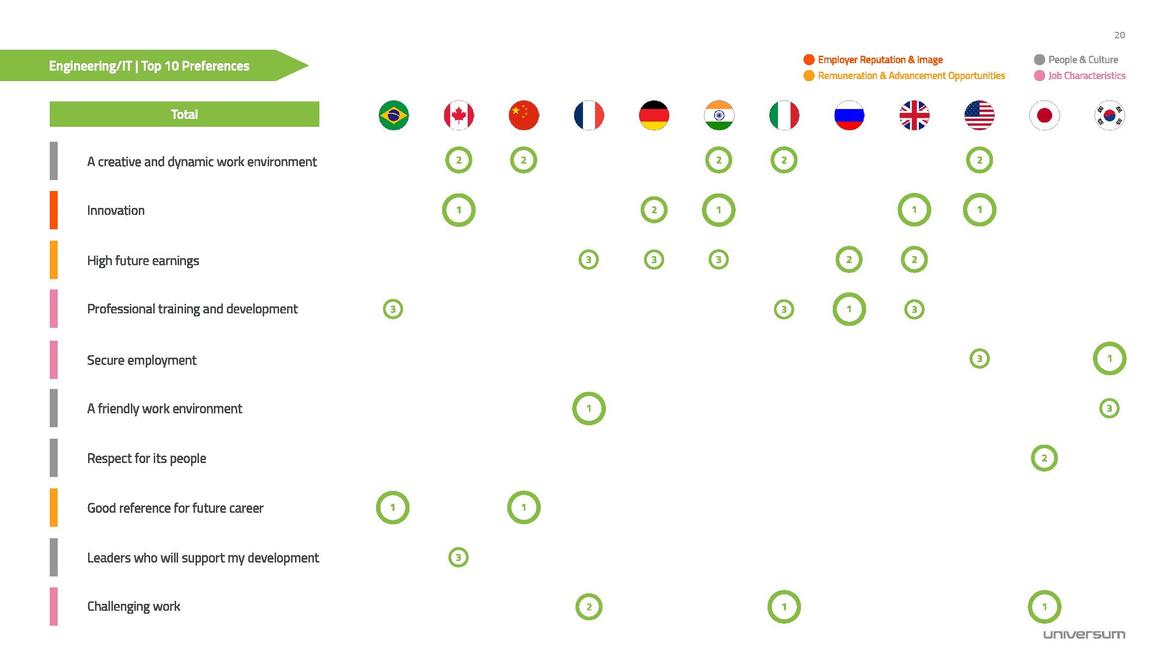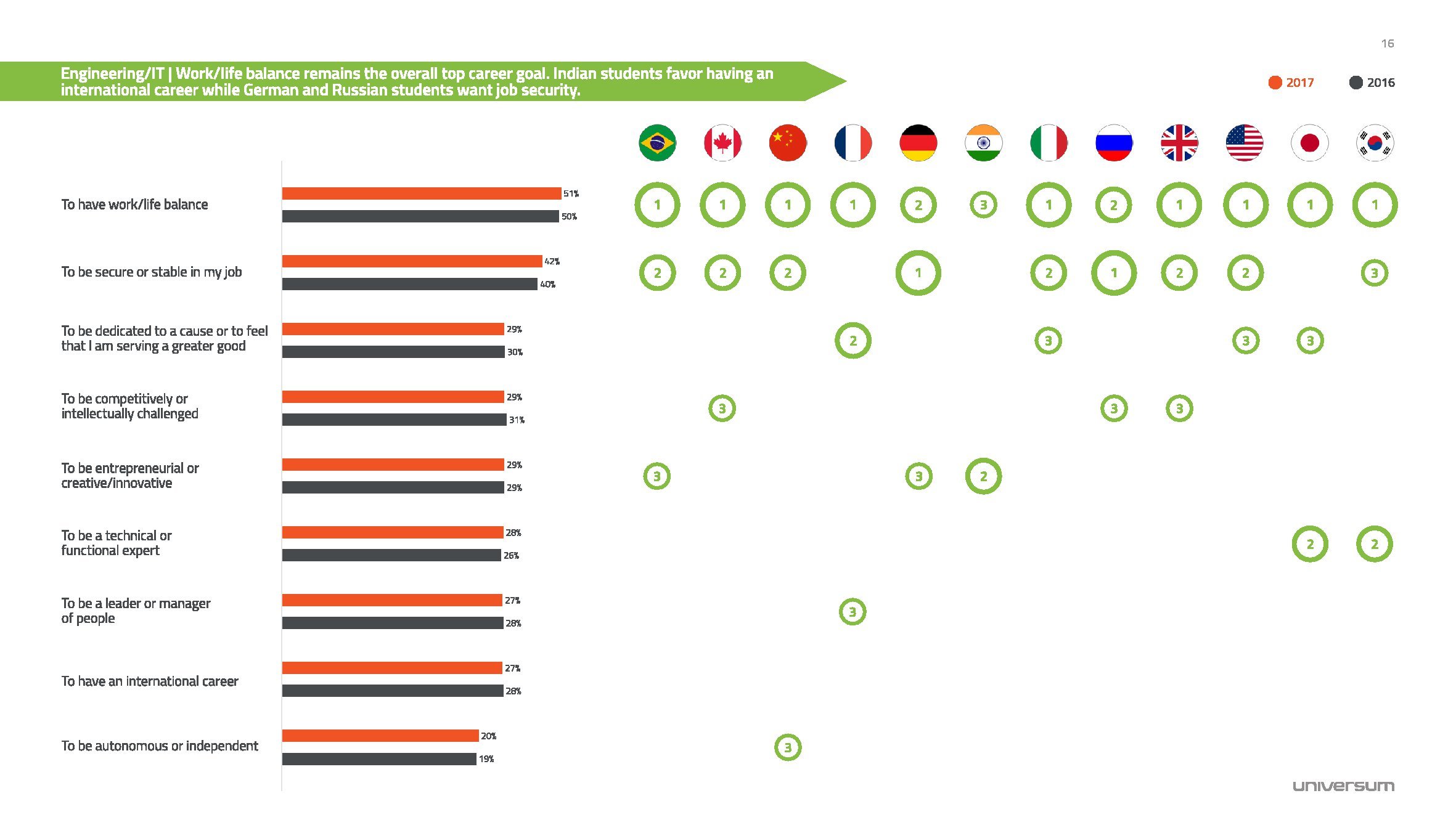 Universum调查了巴西、加拿大、法国、中国、德国、印度、意大利、日本、俄罗斯、韩国、英国和美国近30万商业和工程/IT专业的大学生,希望了解哪些企业特质对他们最有吸引力。