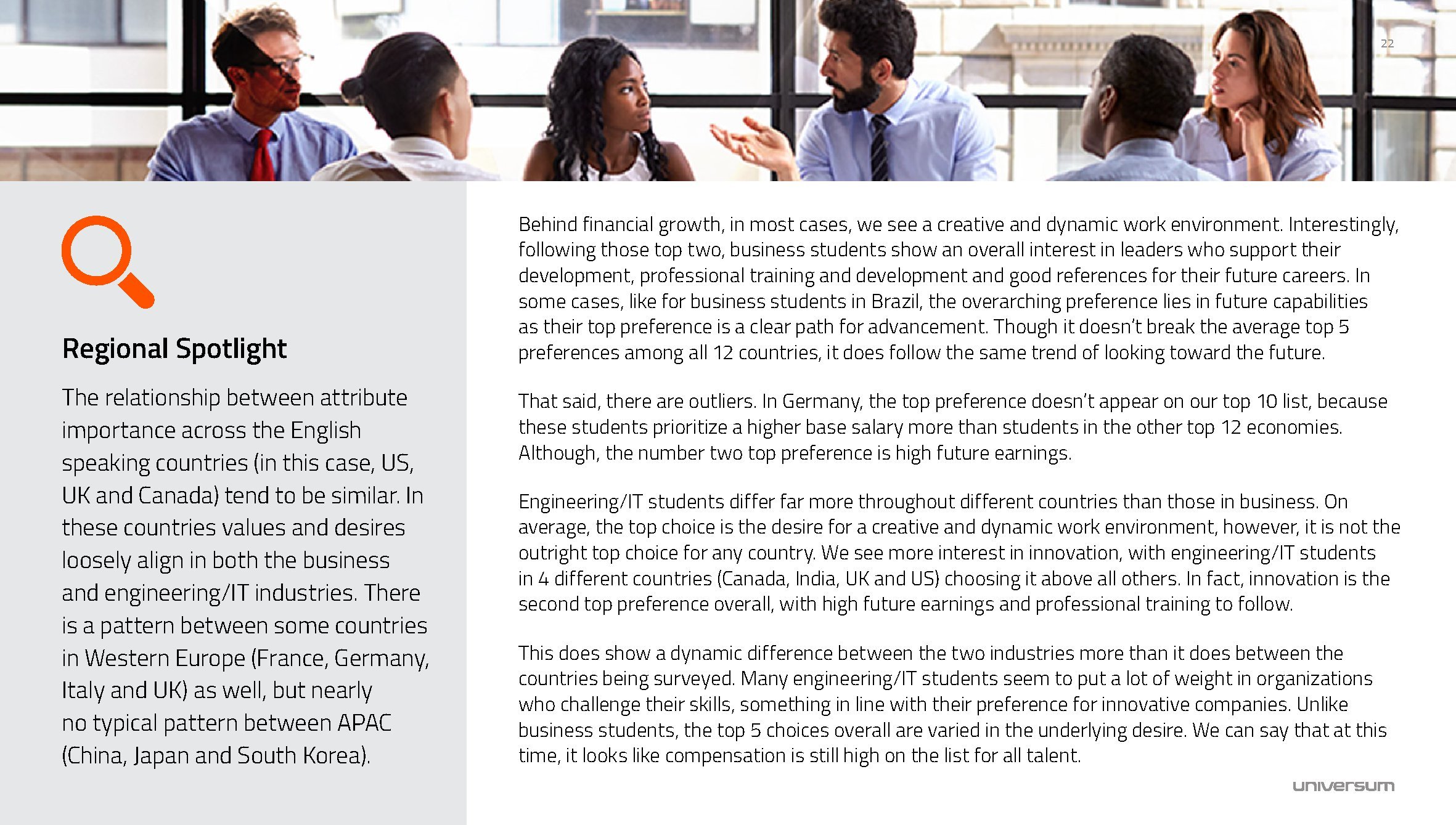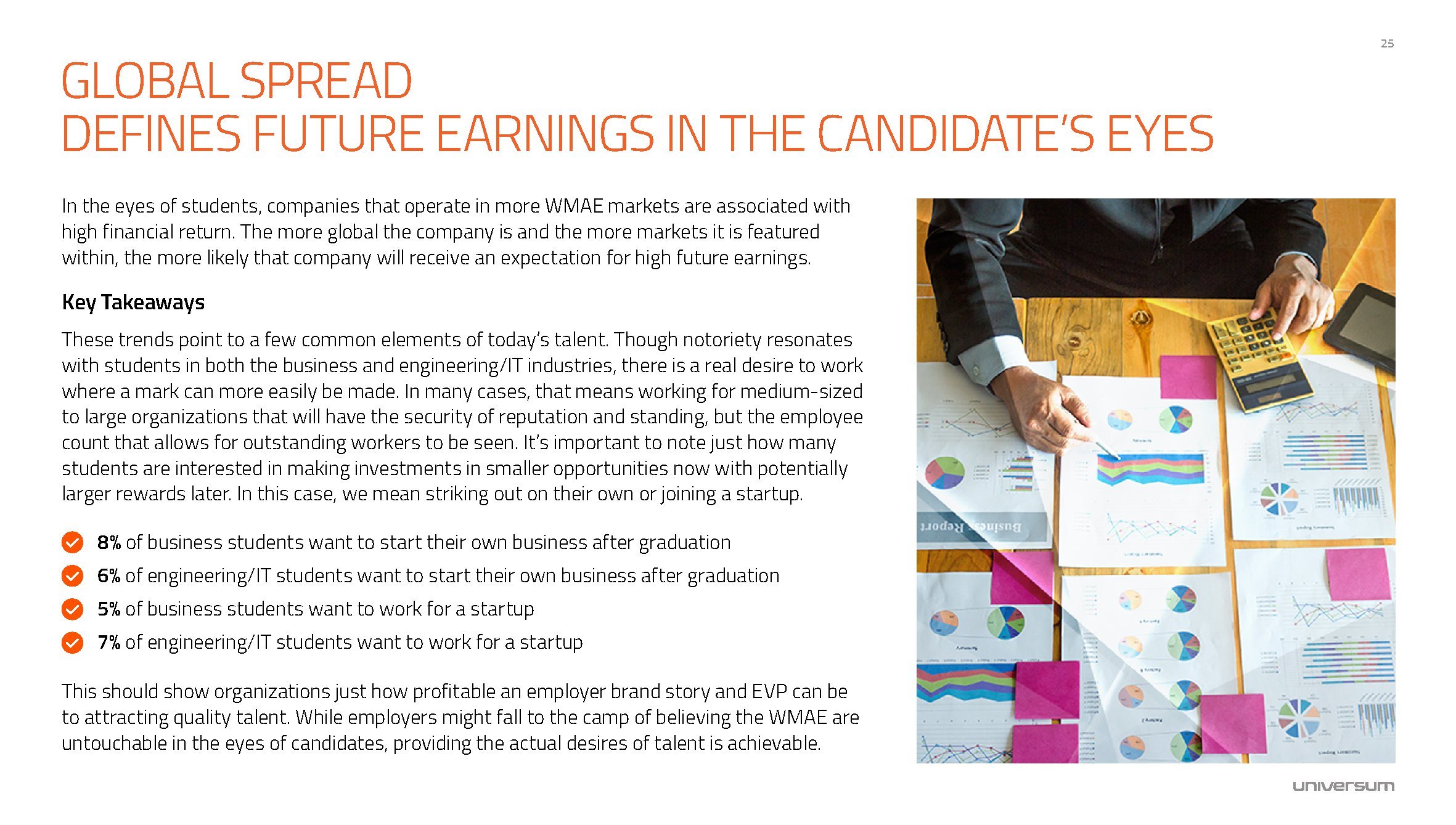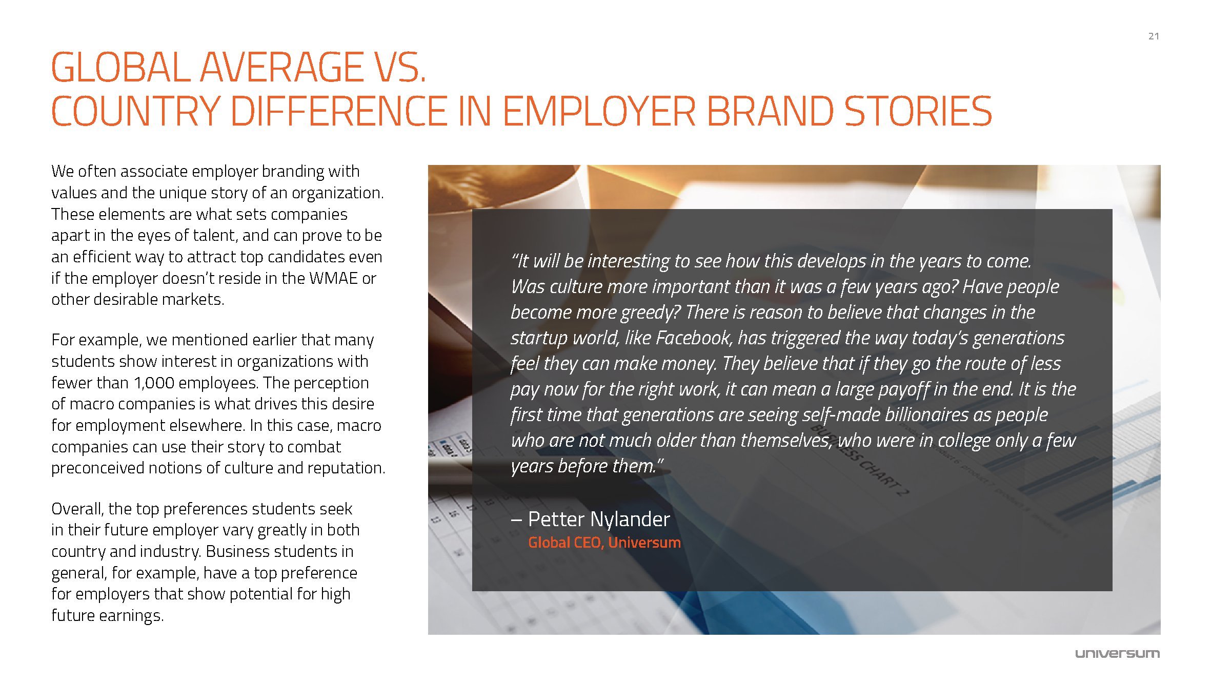调查发现,雇主认为学生的欲望都是相似的,无论他们在哪个国家。但是,本地化差异是显而易见的。那些根据本地文化创作品牌故事的企业往往最能引起学生的共鸣。