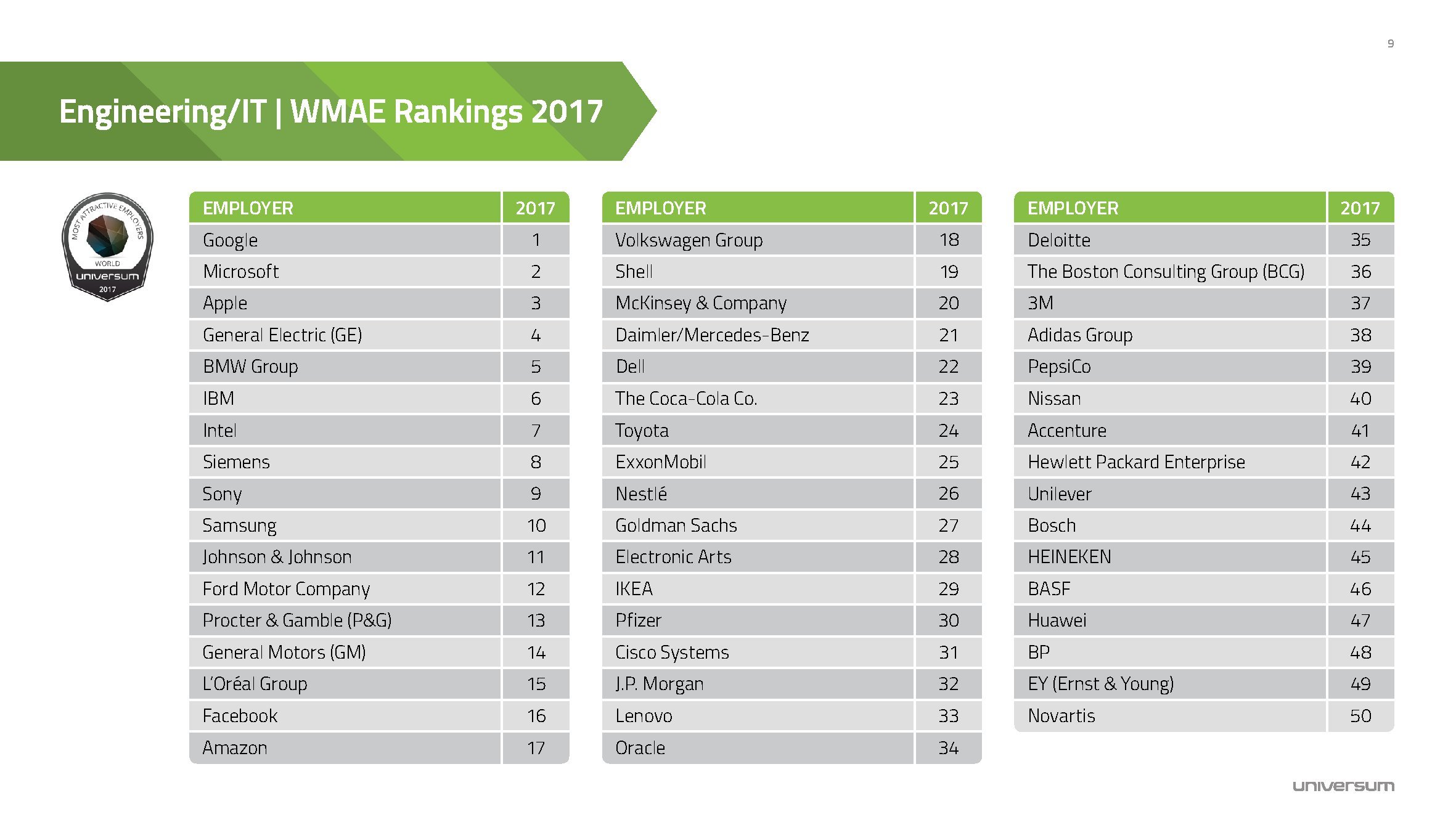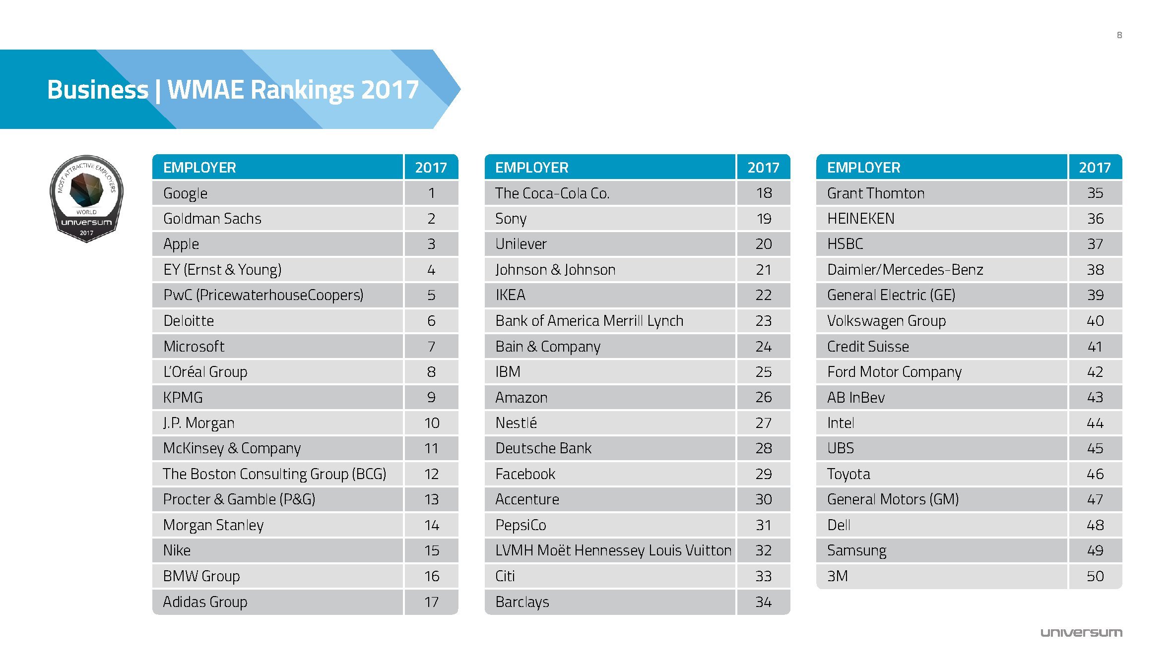 今年,对商科学生最有吸引力的企业是谷歌、高盛和苹果;而对工程/IT专业的学生来说,谷歌、微软和苹果最有吸引力。