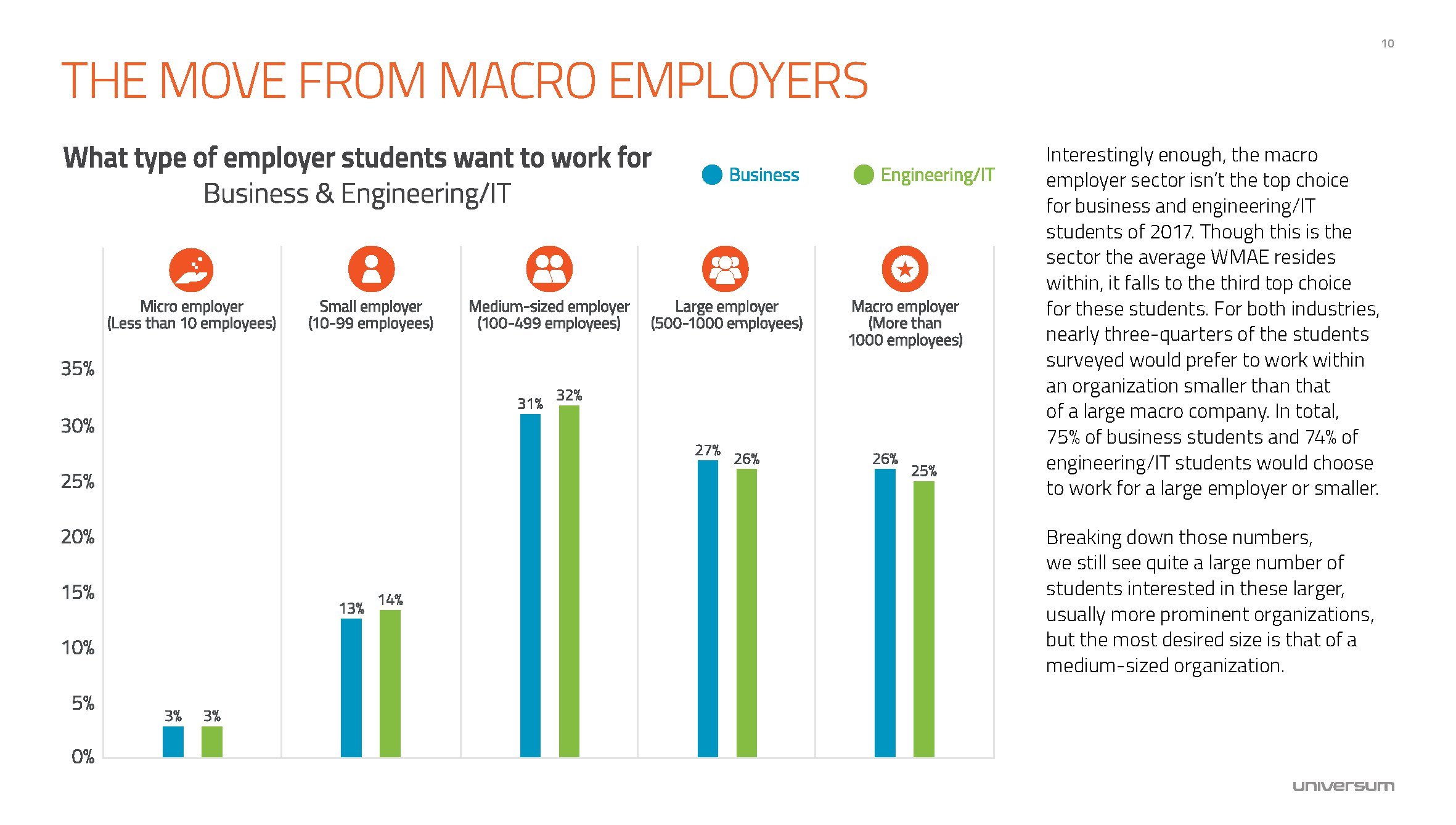 商业和工程/IT专业的学生并不喜欢大型雇主,即员工超过1000人的企业。