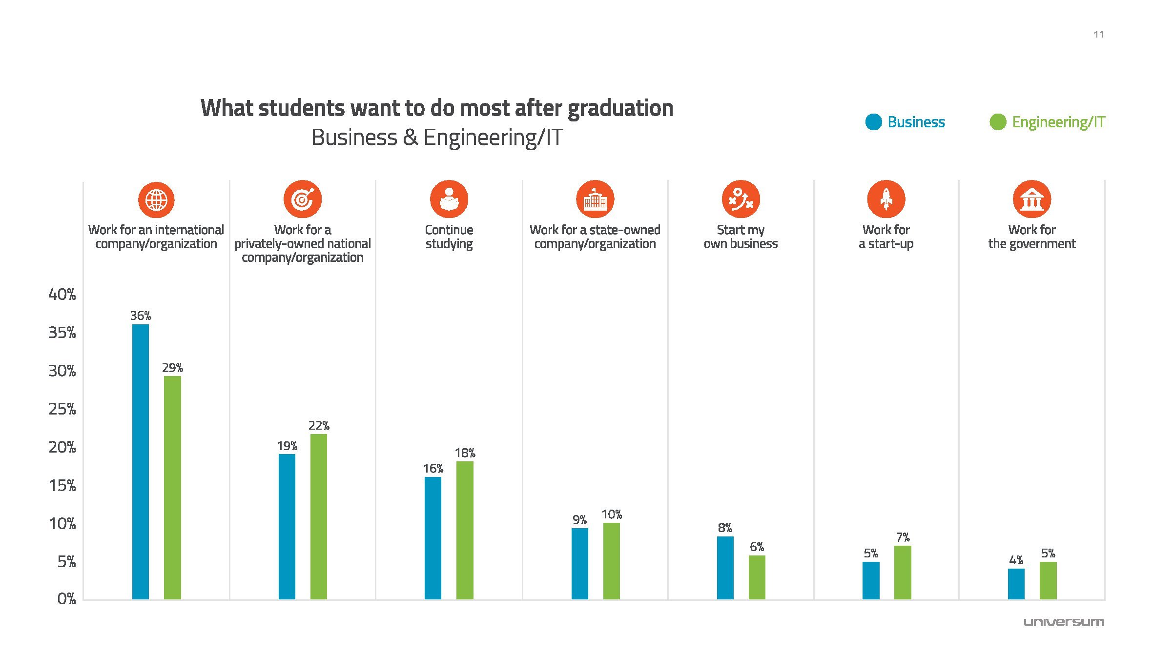 管理和战略顾问式商科学生最喜欢的工作(28%),其次是银行(25%)、金融服务(23%)、会计/审计(19%)和媒体/广告(17%)。工程/IT专业的学生更喜欢软件(23%)、工程和制造(21%)、航天(20%)、汽车(17%)和能源(16%)方面的工作