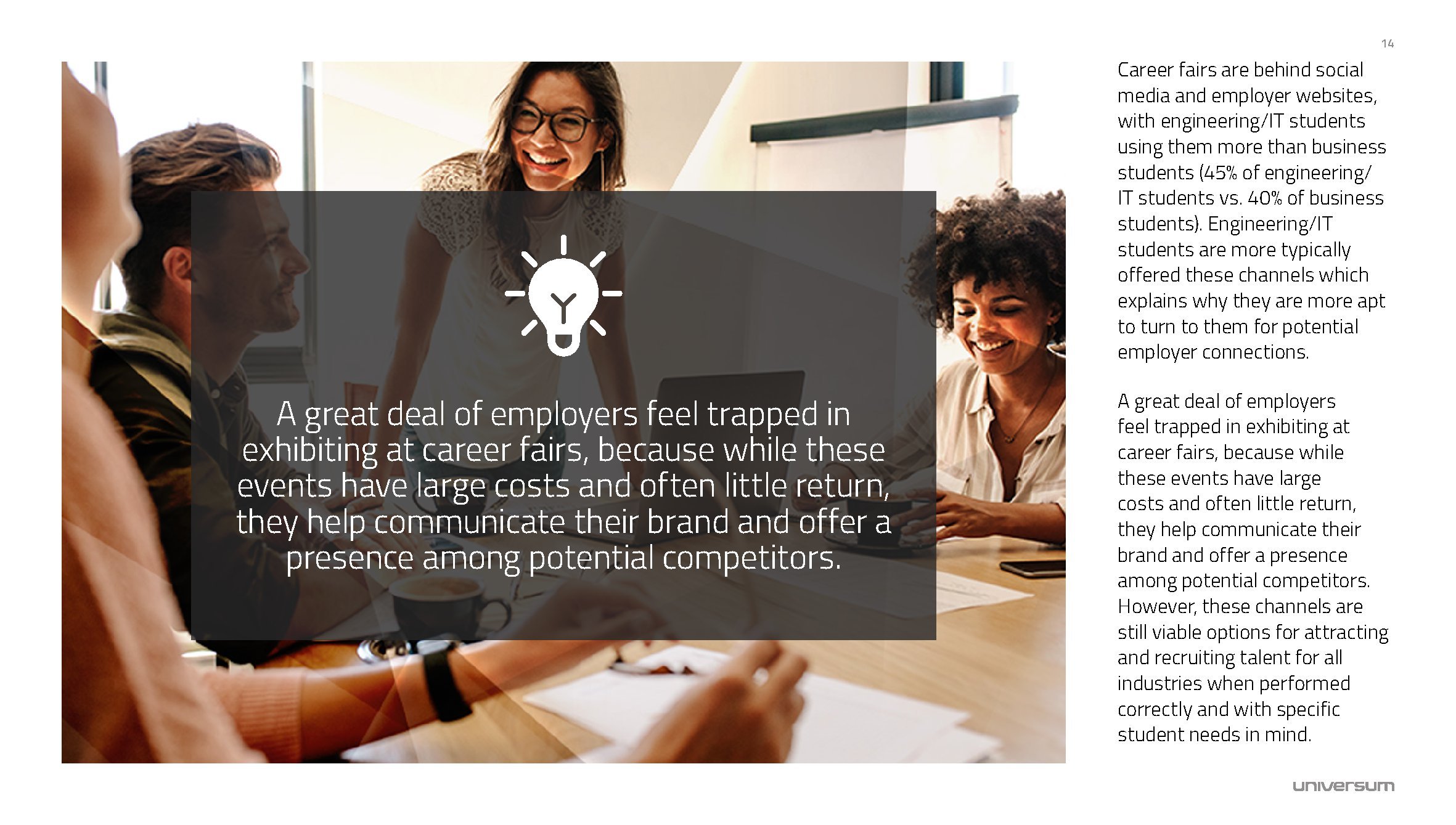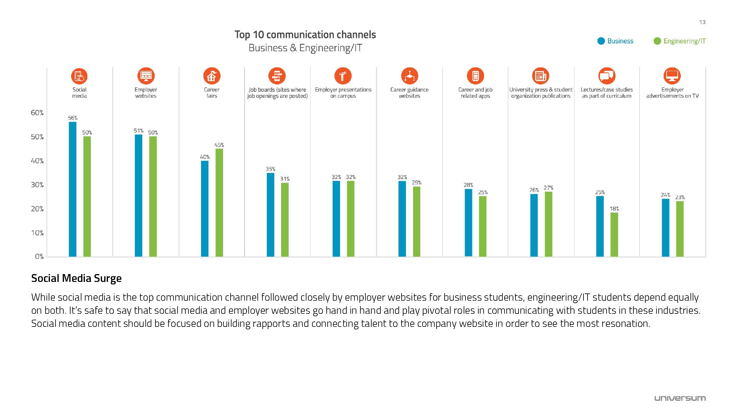 社交媒体仍然是商科和工程/IT专业的学生们和潜在雇主交流的主要渠道(56%,50%),企业网站(51%,50%)紧随其后,其次是招聘会(40%,45%,)、招工栏(35%,31%)和企业校园宣讲会(32%,32%)。