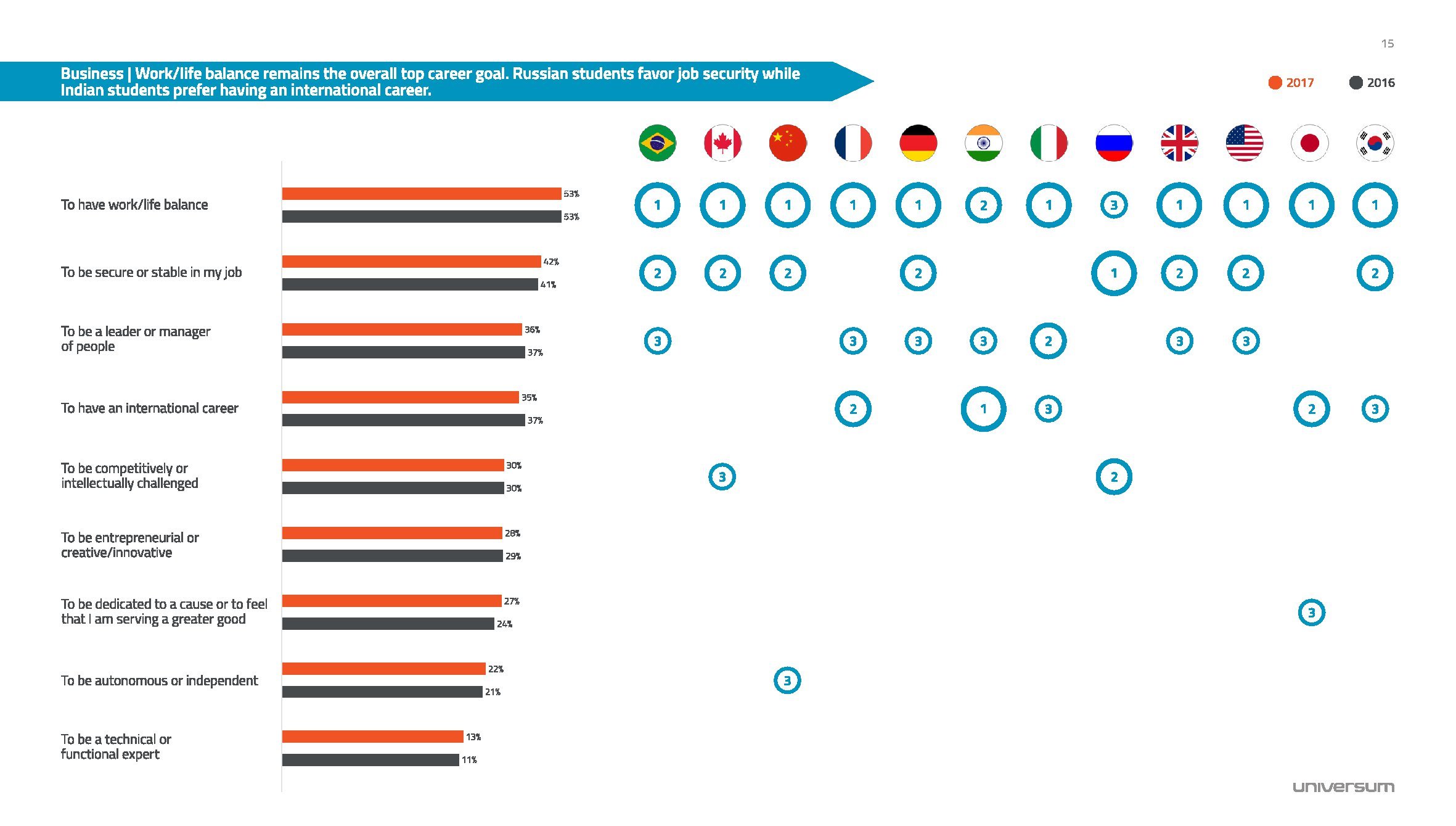 工作和生活的平衡对学生最重要(53%,51%),其次是安全和稳定(42%,42%)。