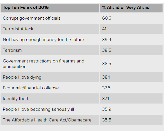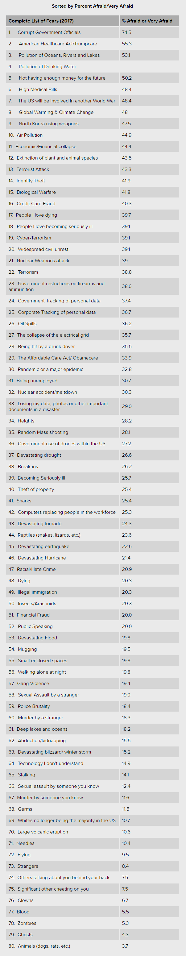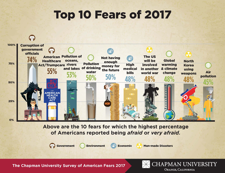 查普曼大学调查对让美国人最恐惧的事情,包括犯罪、政府、环境、灾害、个人焦虑、科技等许多话题。