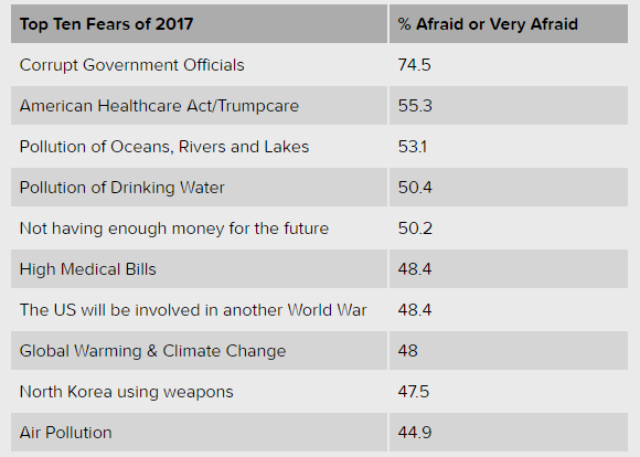 大多数美国人(53.1%)担心“海洋、河流和溪流”的污染。水污染首次出现在十大恐惧列表中。