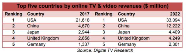 首席分析师Simon Murray表示:“到2022年,有14个国家的OTT营收将超过10亿美元,是2017年底的两倍。其中,前5个国家将占据全球三分之二的营收。”