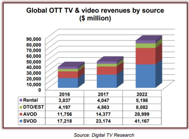 据Digital TV Research最新《全球OTT电视及视频预测》报告指出,2022年,全球138个国家在线电视剧集和电影营收将达到830亿美元,是2016年370亿美元的两倍多。据预测,仅2017年一年就将增加90亿美元营收。