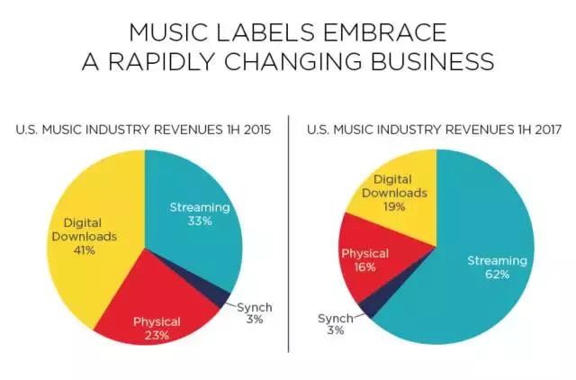 在收益方面,流媒体占比也越来越大,从2016年的33%到2017年中的62%,流媒体消费也直接挤压了数字下载和实体唱片的生存空间。同时,这也反映出音乐流媒体消费市场已经足够大,且具有支撑音乐产业完成模式转型的能力。