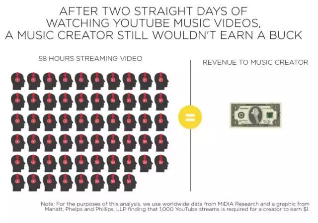另据RIAA(美国唱片业协会)的调查结果,在YouTube播放58小时的音乐视频,另一头的音乐人连1美元都赚不到。