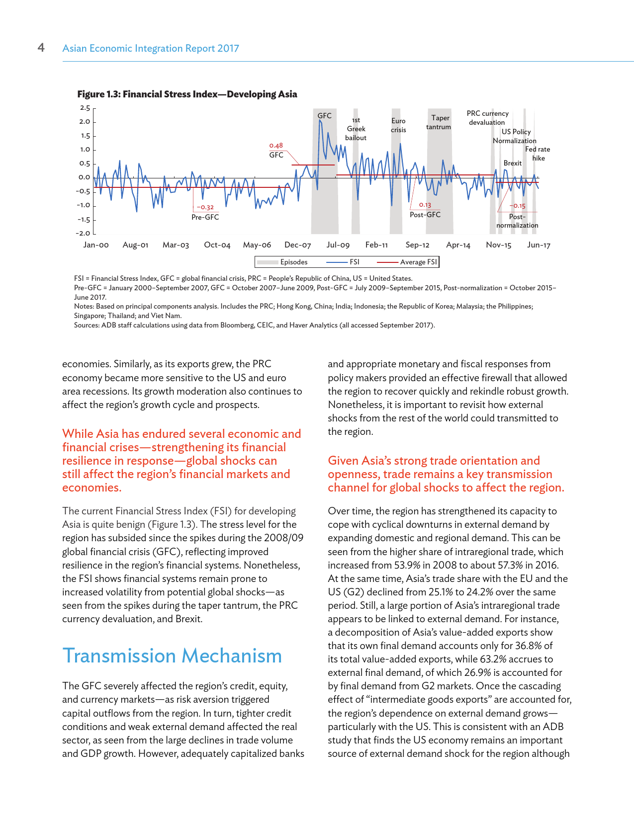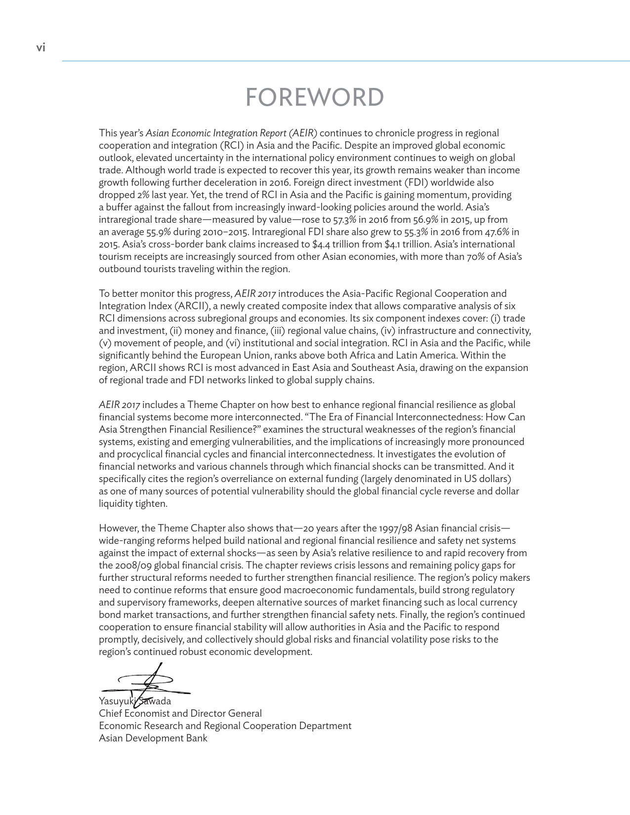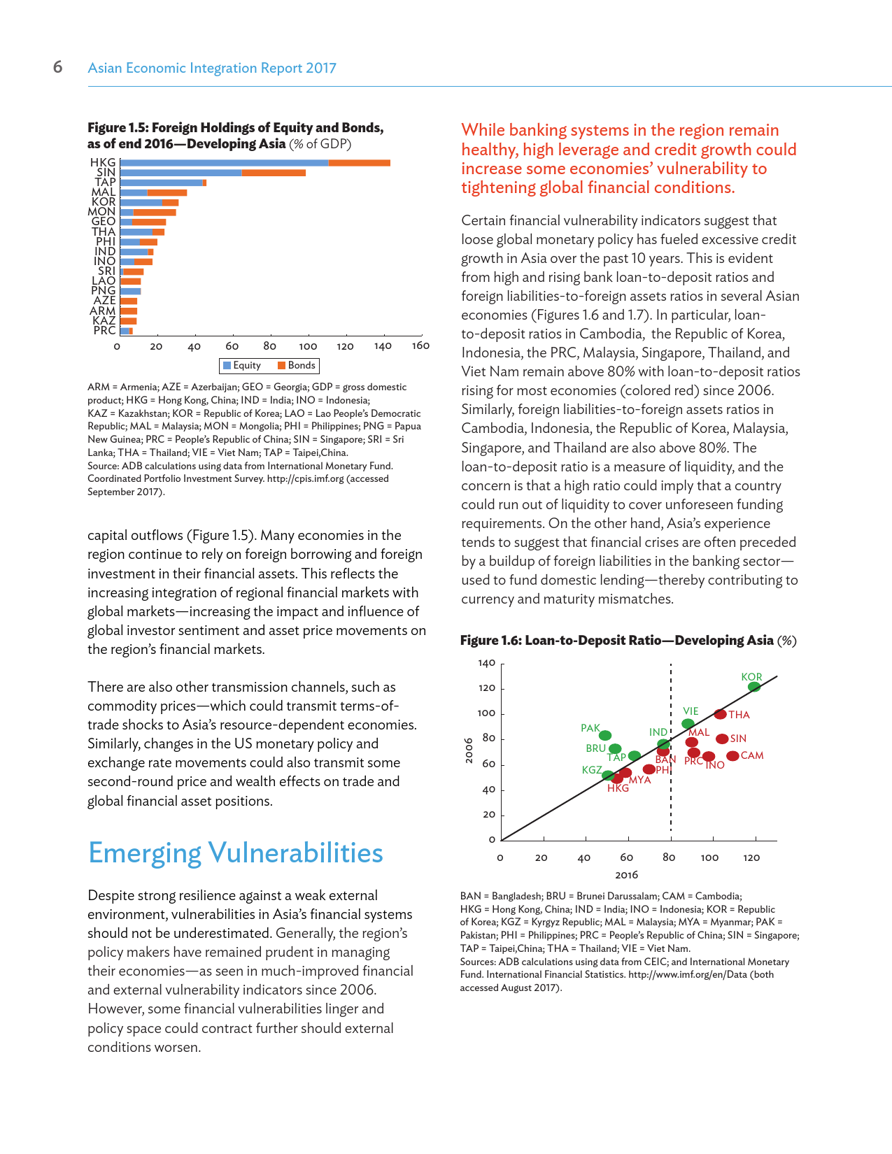 《2017年亚洲经济一体化报告》中,亚行研究分析了区域一体化的近期趋势,并提出了一种新的区域一体化指数。报告还设立了一个专题章节,探讨亚洲如何在金融互联时代加强金融韧性。