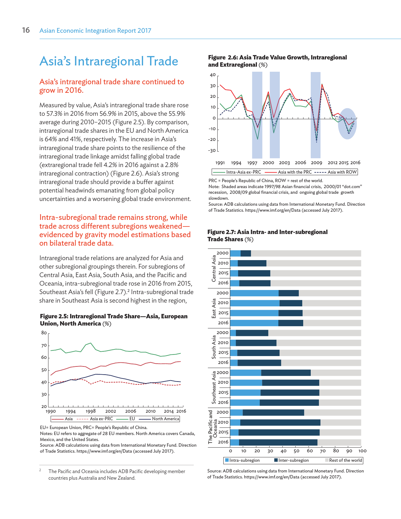 报告指出,强劲的区域内贸易和投资发挥着缓冲作用,使该地区免受全球贸易和经济增长不确定因素的冲击。2016年,亚洲区域内贸易份额——按价值计量——由2010至2015年的55.9%(平均值)增长至57.3%,创历史新高。