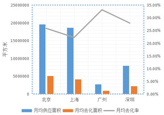 与其他一线城市呈鲜明对比的是深圳,三季度月均供应面积环比增加46㎡,去化面积增加2万㎡,去化率增长1%。得益于上半年深圳经济的快速增长,优质的营商环境吸引了不少新进入深圳的企业,商办地产整体市场趋向活跃。