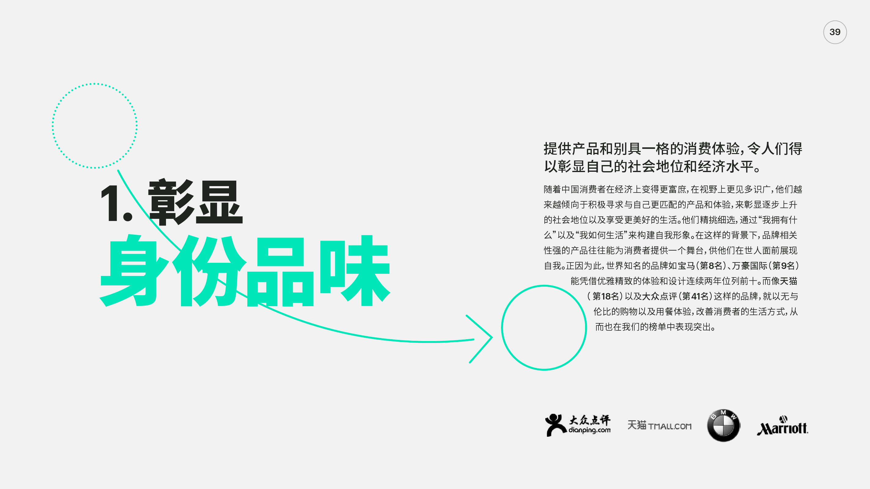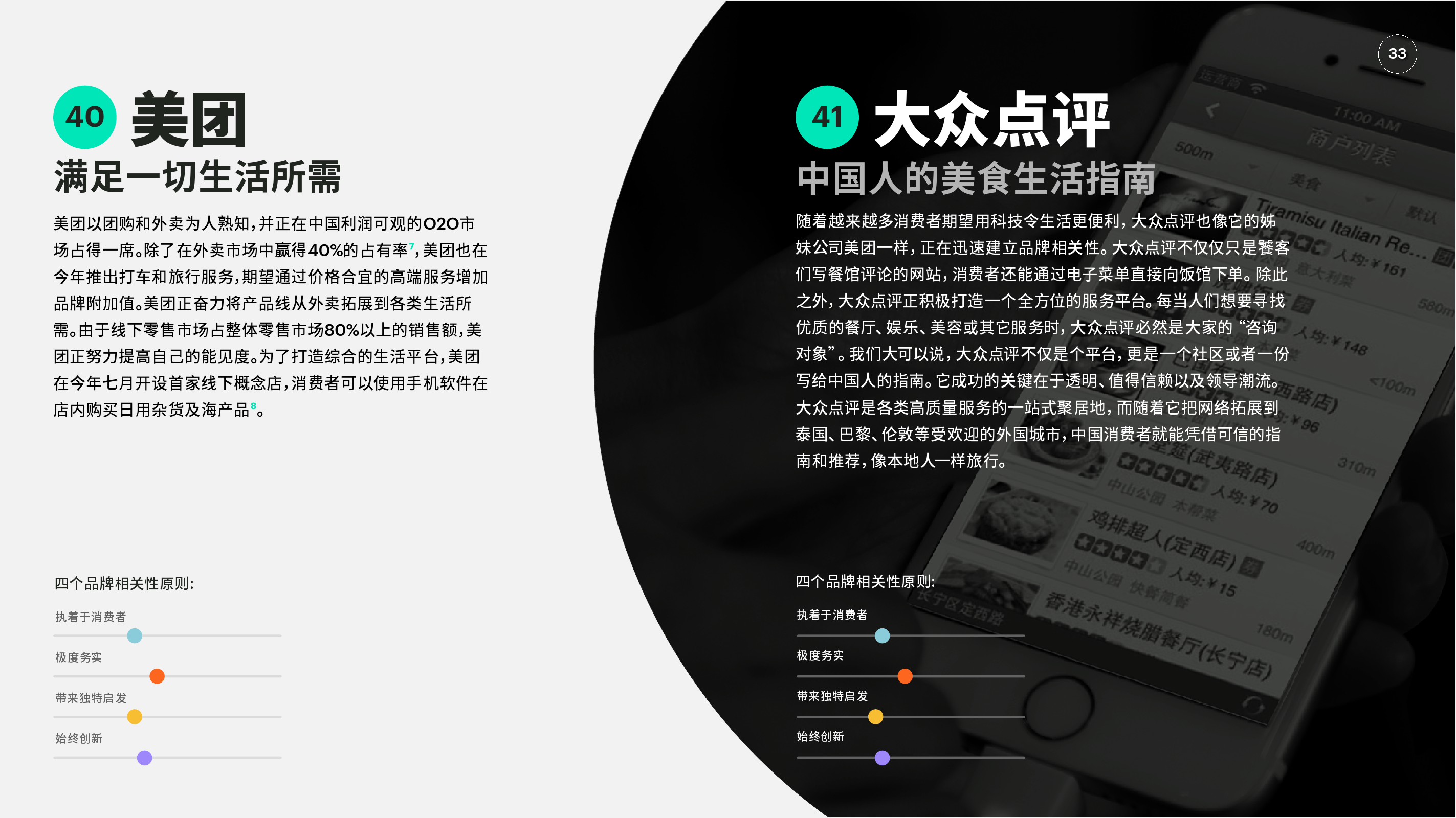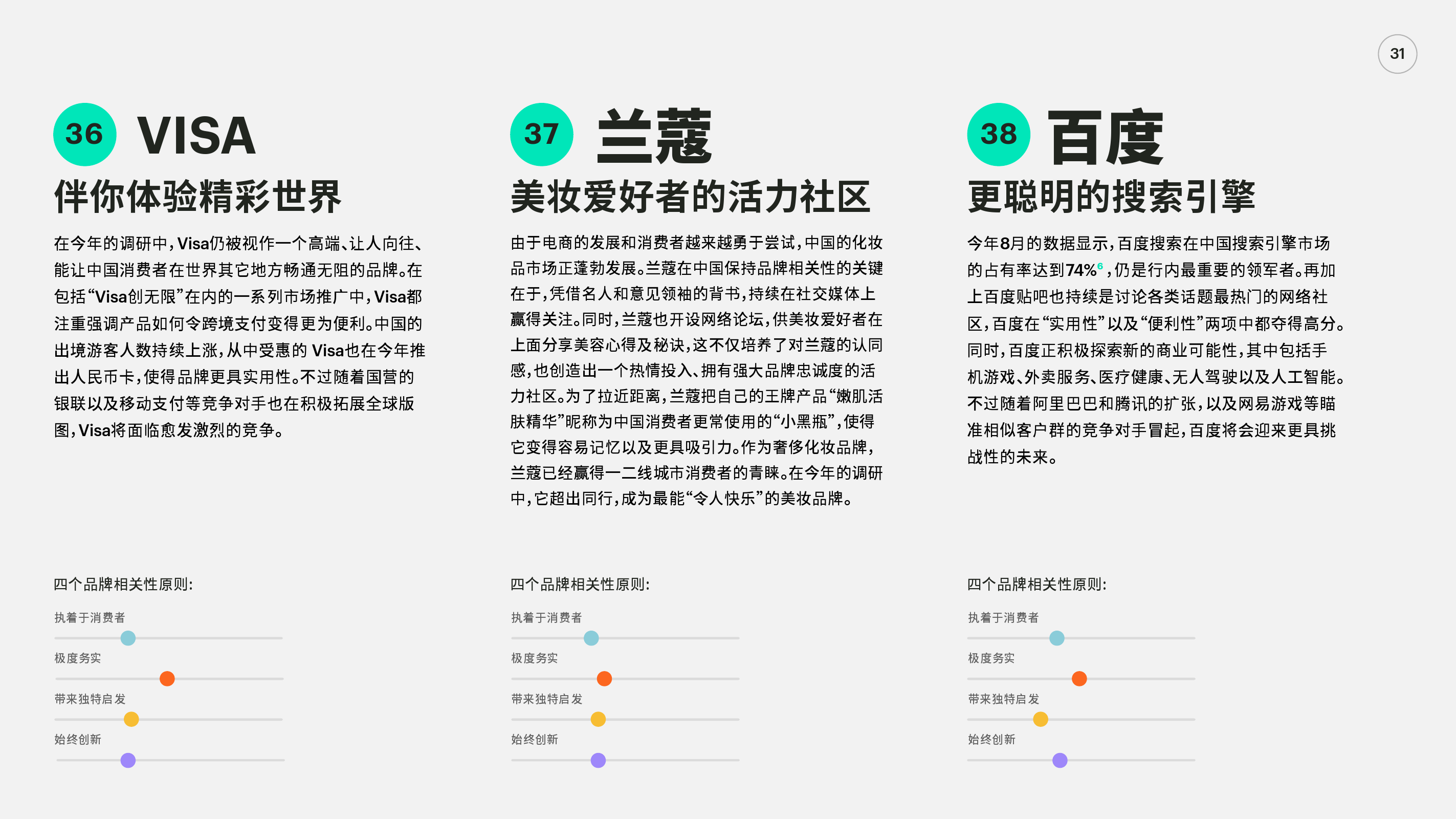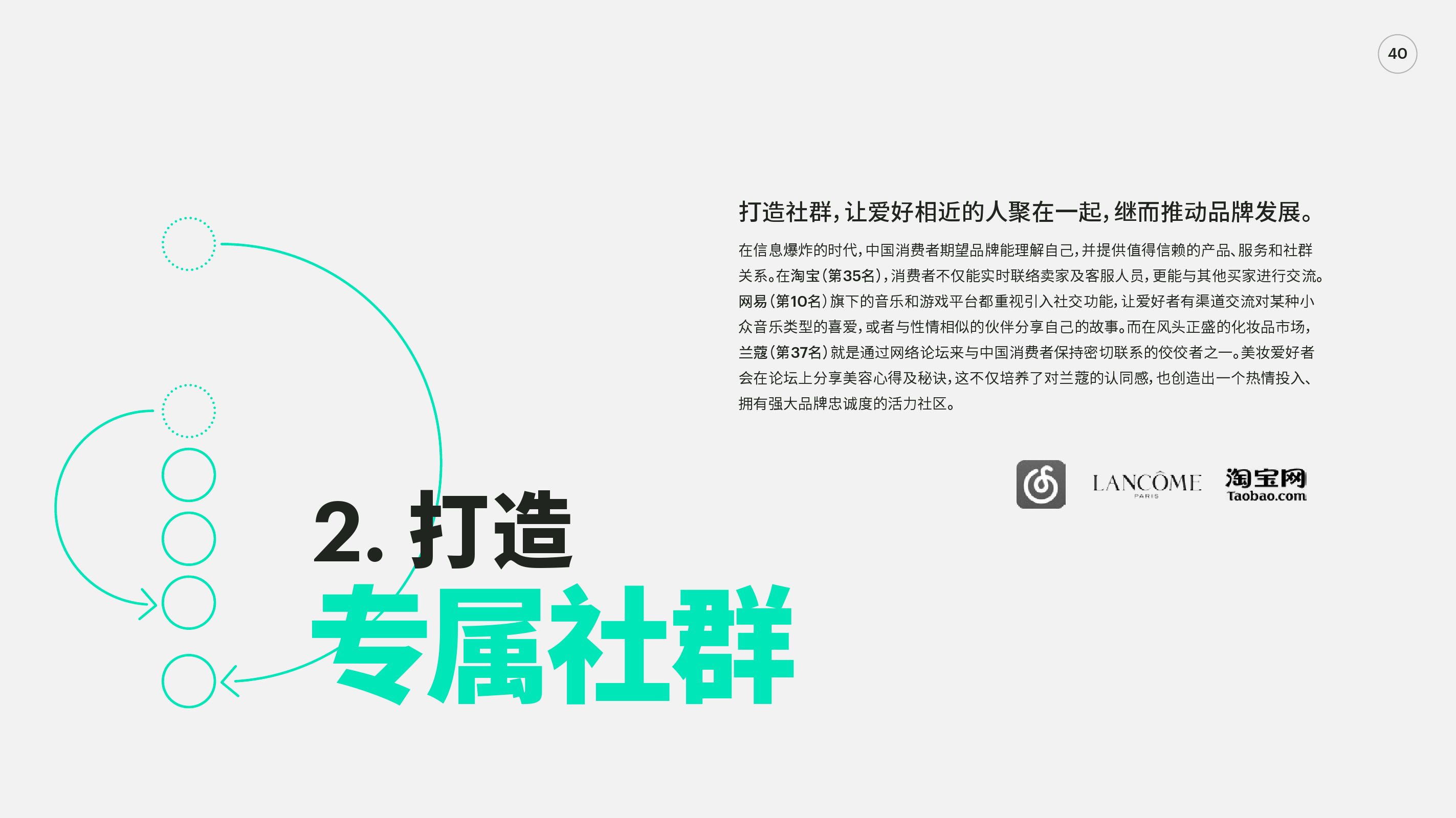 QQ(第28名)正是满足上述需求的强大品牌。另外,消费者积极寻找能满足自己个性化需求的产品。他们对于搜罗不同商品(淘宝,第35名),体验各种服务(美团,第40名)以及品尝各类美食(大众点评,41名)抱有极大兴趣。
