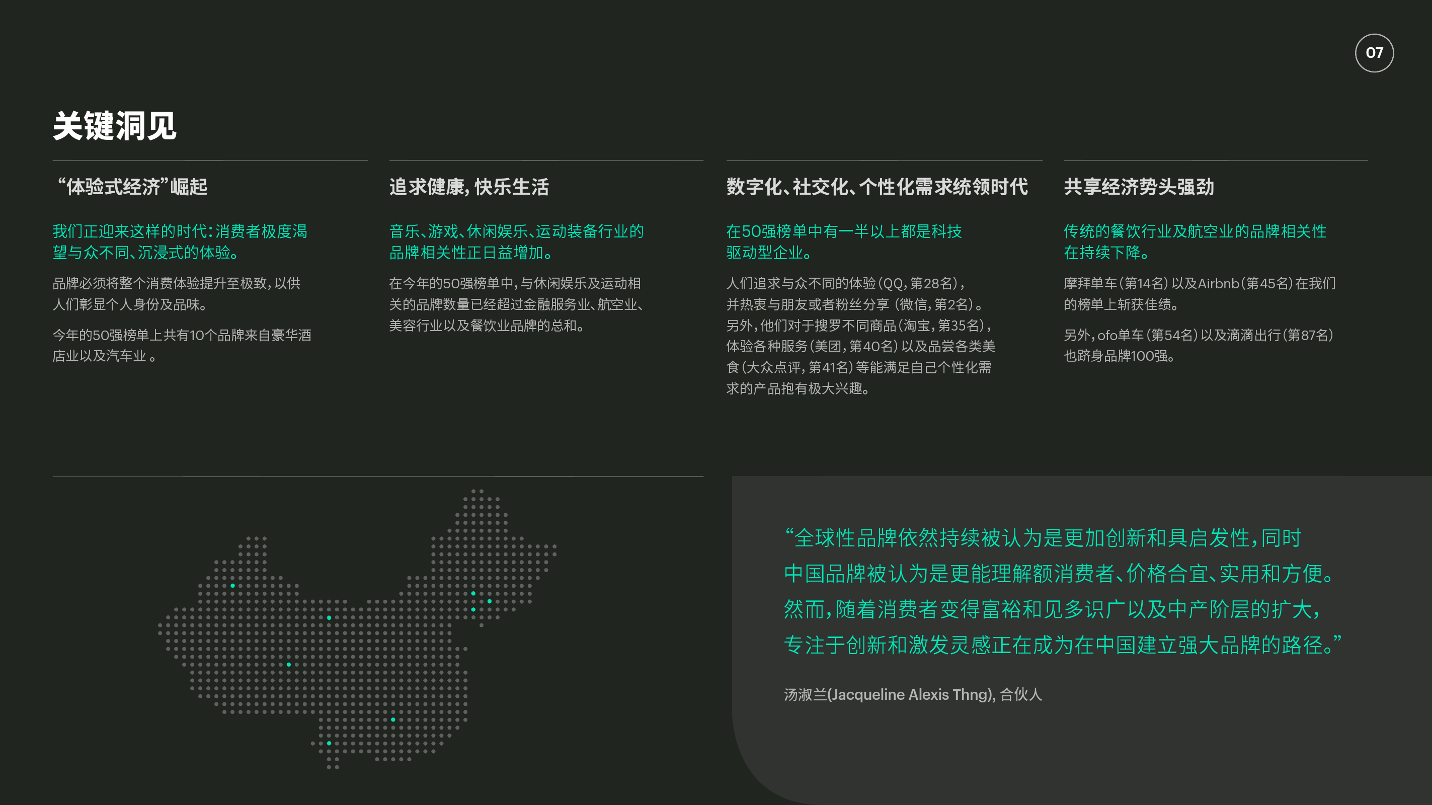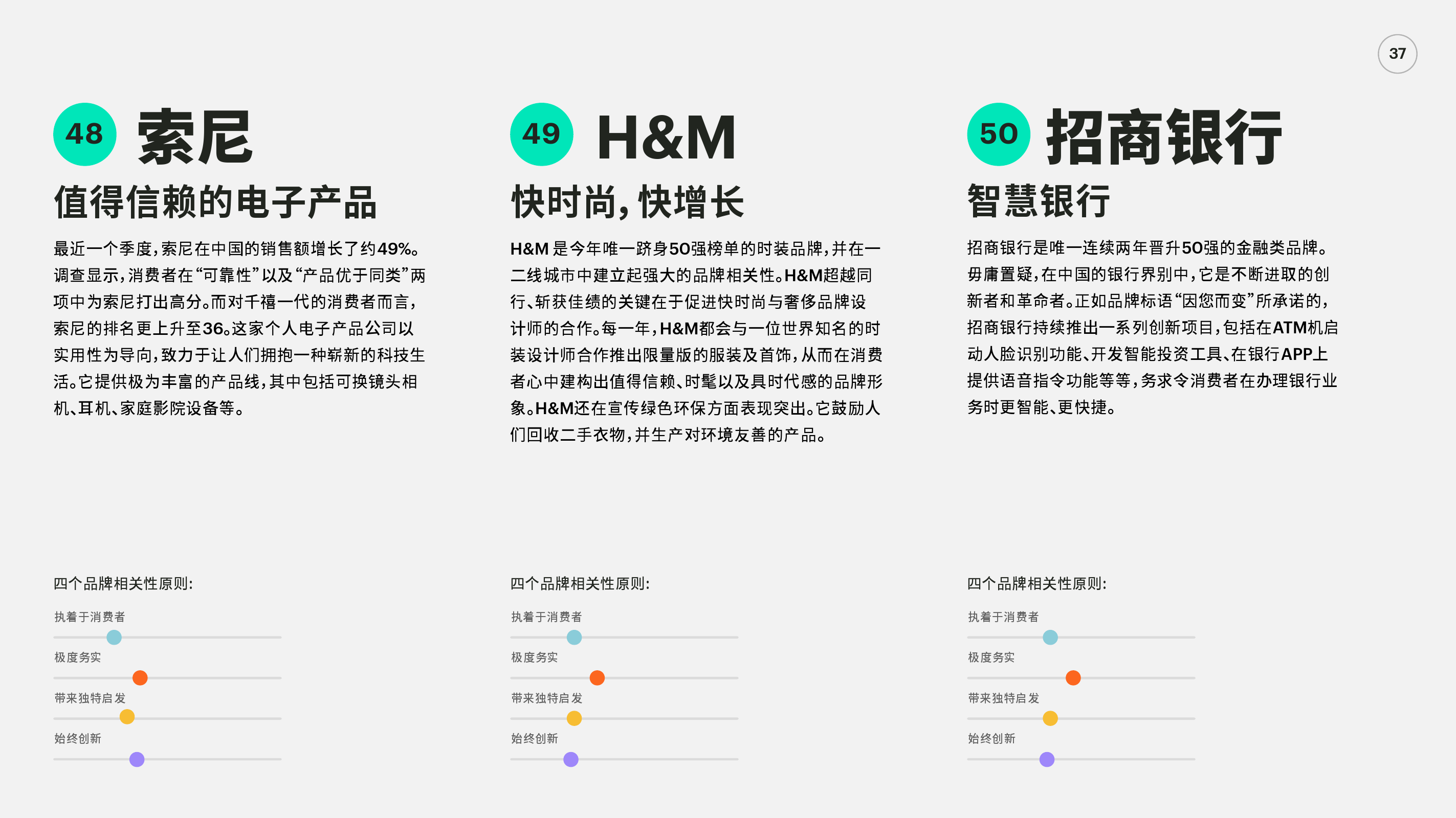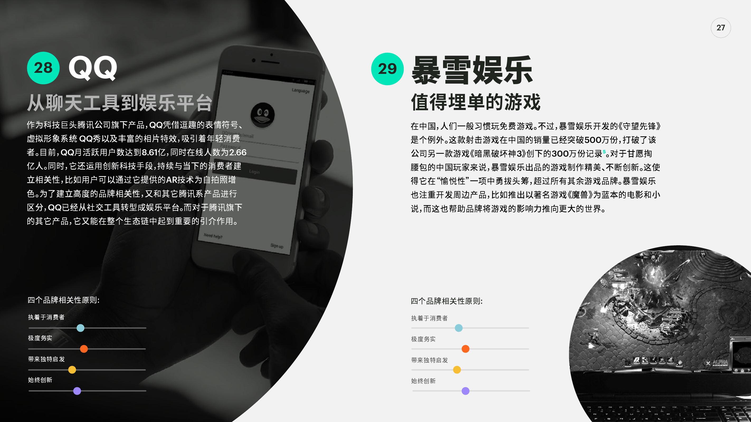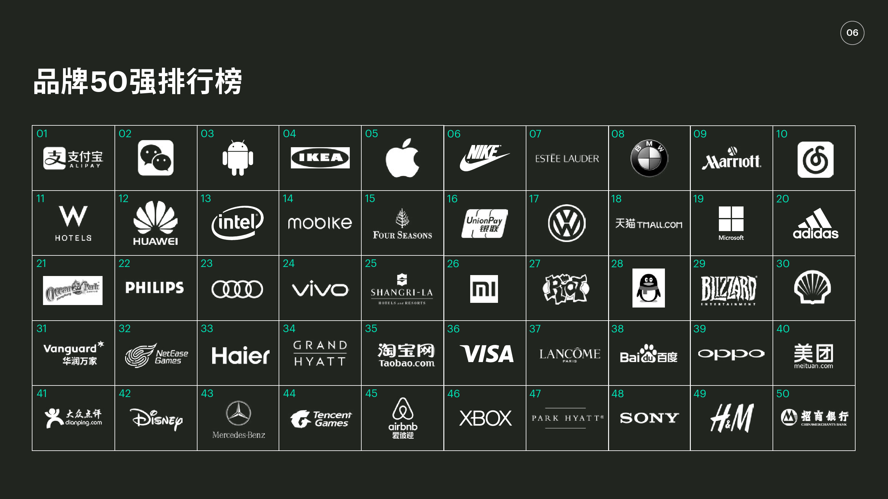 QQ(第28名)正是满足上述需求的强大品牌。另外,消费者积极寻找能满足自己个性化需求的产品。他们对于搜罗不同商品(淘宝,第35名),体验各种服务(美团,第40名)以及品尝各类美食(大众点评,41名)抱有极大兴趣。