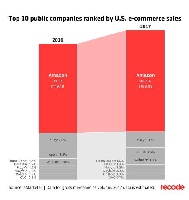 亚马逊在2016年的市场份额为38%,销售额为1490亿美元,仍然是美国最大的电子商务公司,eBay、苹果和沃尔玛紧随其后。