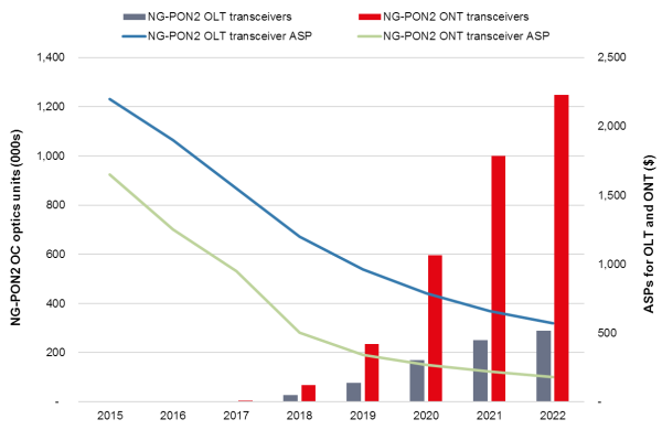 图五:2015-2022年NG-PON2 OLT和ONT(光组件和平均售价)。来源:Ovum。