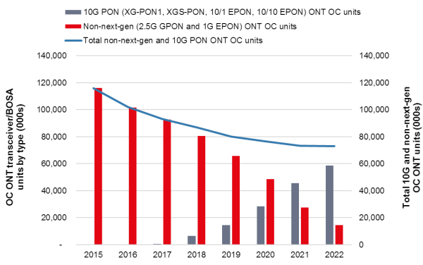 图四:2015-2022年PON ONT光组件预测,下一代VS10G。来源:Ovum。