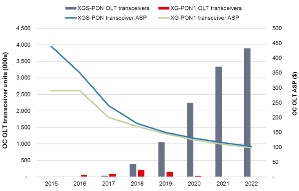 图三:2015-2022年10G GPON OLT光组件预测(出货量和平均售价):XGS-PON和XG-PON1。来源:Ovum。