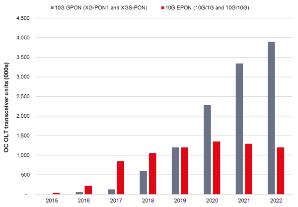 图二:2015-2022年10G PON OLT光组件预测(10G GPON and 10G EPON)。来源:Ovum。