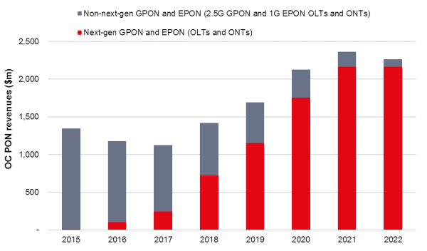 图一:2015-2022年OC PON收入预测。来源:Ovum。