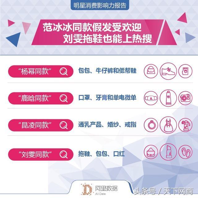 每个明星的定位和属性不同,他们“带货”方向也不尽相同,比如“杨幂同款”搜索关键词是包包、牛仔裤和低帮鞋;“鹿晗同款”是口罩、牙膏和单电微单;而初为人母的天王嫂昆凌的“同款”搜索关键词第一位不是女装也不是美妆,竟然是“通乳产品”!中国第一超模“大表姐”刘雯则是穿个拖鞋也能引起大家效仿,她的“同款”搜索关键词清单里,“拖鞋”二字赫然在列。