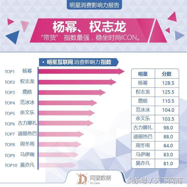 《报告》显示,杨幂综合得分最高,“带货女王”称号实至名归。紧随其后的的明星分别是权志龙、鹿晗、范冰冰、余文乐、古力娜扎、迪丽热巴、周冬雨、马伊琍和吴亦凡。