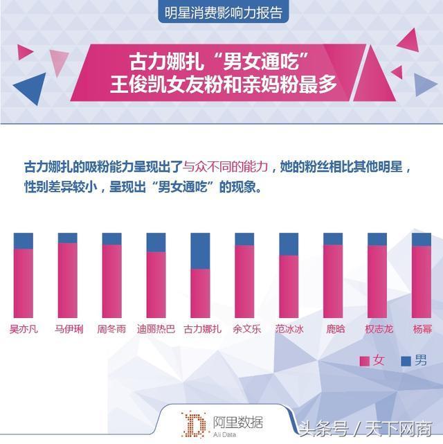 数据显示,超过80%的追星族为女性。即便如此,古力娜扎的吸粉能力仍然呈现出了与众不同的能力,她的粉丝相比其他明星,性别差异较小,呈现出“男女通吃”的现象。