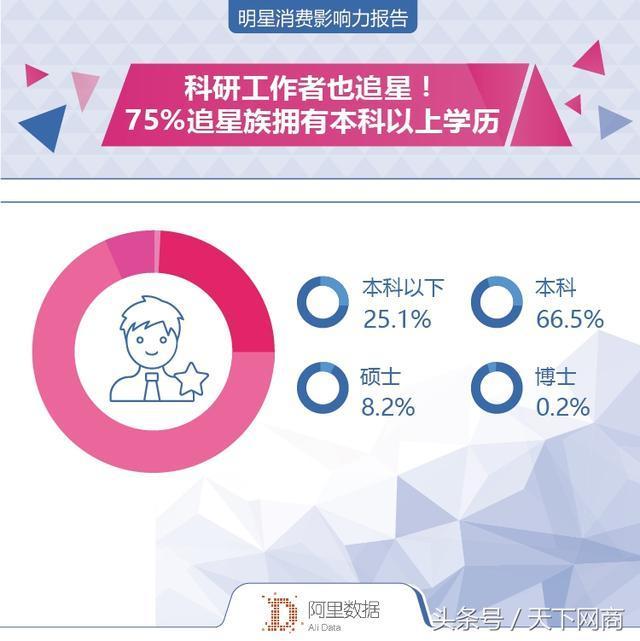 还以为只有学生才追星吗?那你就OUT啦!阿里数据显示,除了学生以外,科研工作者、公务员、老师、金融精英、媒体人、医生等职业也是追星族的重要组成部分,75%的追星族拥有本科及本科以上学历。