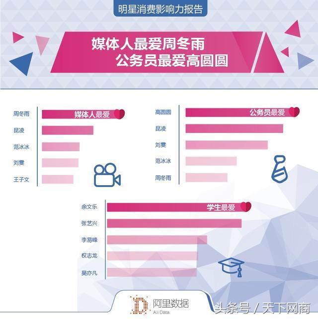 值得关注的是,不同职业群体对不同类型的明星偏爱度不同。比如,媒体人偏爱周冬雨,鬼马精灵的小妞人设;拥有一张无敌甜美无害的笑脸,亲和力满分的高圆圆则深受到公务员人士的喜爱!学生群体则更偏好男星,尤其是“小鲜肉”,比如张艺兴、余文乐、李易峰、吴亦凡、王源等,他们的粉丝群体中学生占比都非常高。