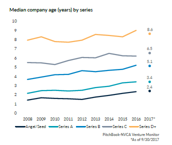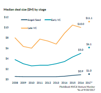 与此同时,由于创业公司保持私有化时间更长,推动了大规模后期阶段交易的产生,因此,平均交易规模在今年上升至1030万美元,是十年来的最高点。2017年前三季度,后期阶段风险投资平均交易额为1100万美元,而天使和种子投资平均交易额为100万美元,早期阶段平均交易额为600万美元。