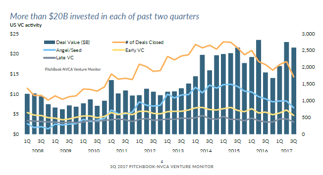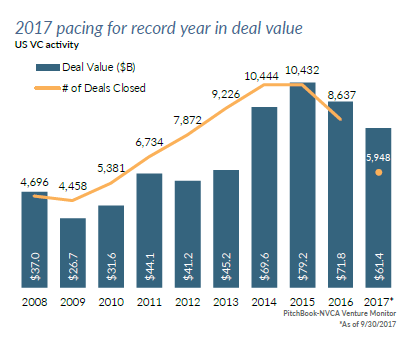 尽管交易数量持续下降,但是,美国风险投资平均交易额创造了新的纪录。2017年前三季度,风险投资公司共完成投资514.4亿美元(5948宗交易)。根据Pitchbook-NVCA Venture Monitor的数据,今年前九个月的交易数量是2011年以来的最低水平,当年1月至9月期间完成5,104宗风险投资交易。