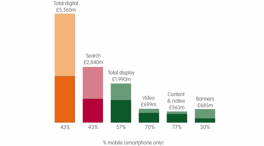 目前,英国网民上网时间一半是智能手机贡献的,这也反映在广告支出方面。移动占网络广告支出份额从35%增长至43%。2017年上半年,英国移动广告支出同比增长38%,占展示广告支出的57%,占视频广告支出的70%,占社交媒体广告支出的83%。
