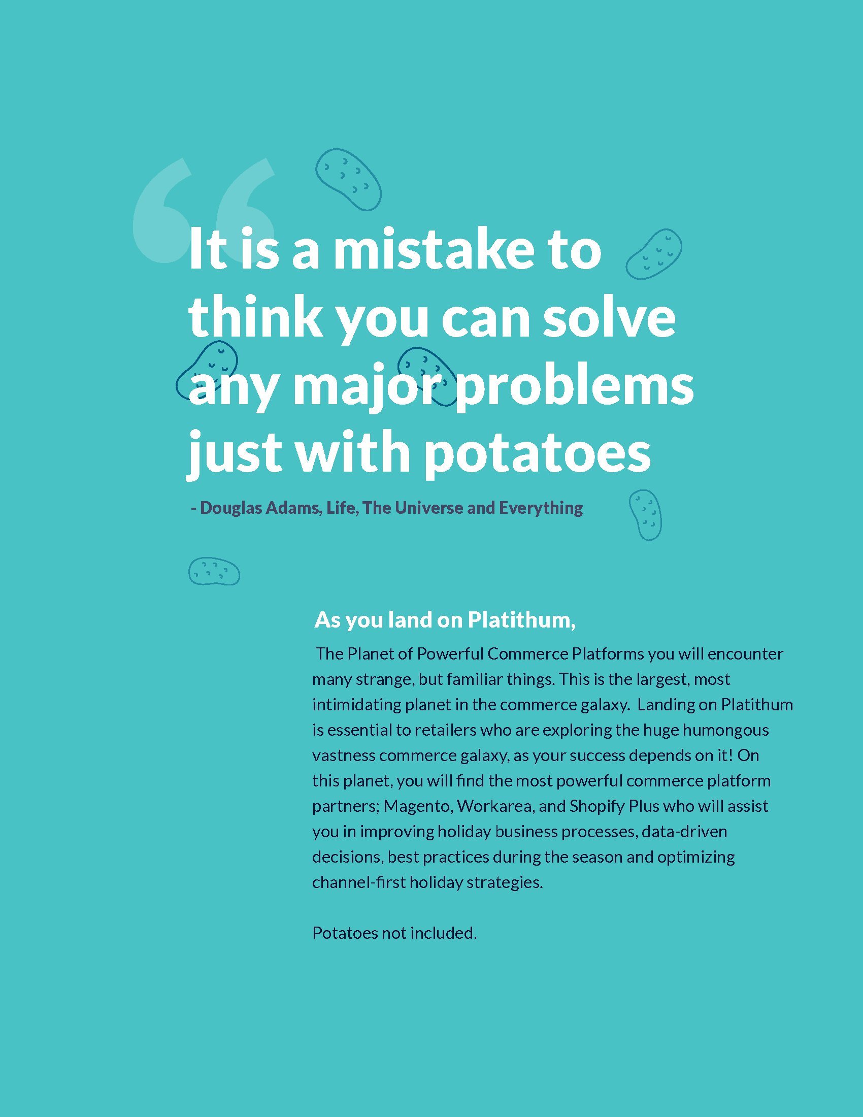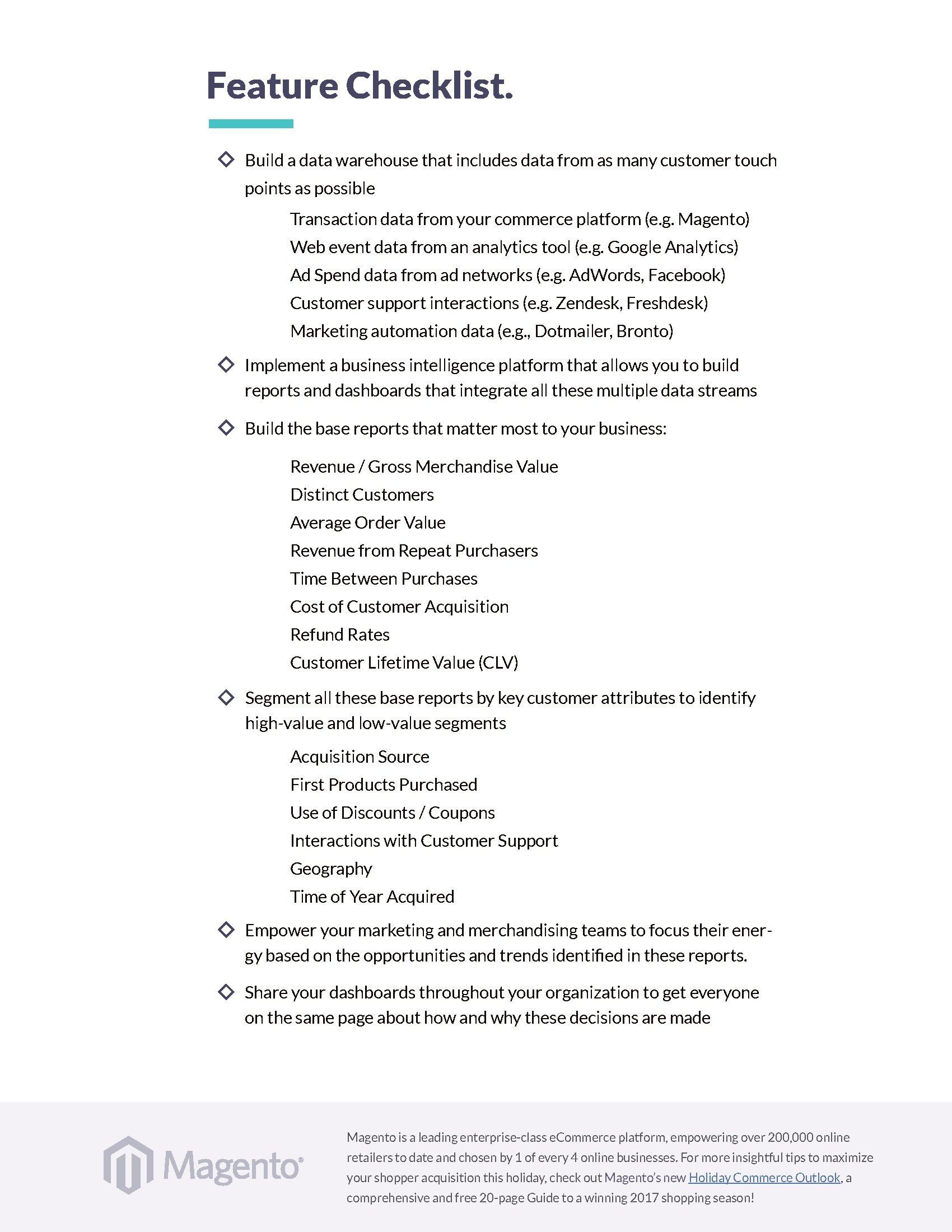 即使你是强大的商务平台,认为凭一己之力能解决所有问题也是错误的。最好的合作伙伴是Magento、Workarea和Shopify Plus。他们能帮你改善假日购物季期间的业务流程、数据驱动决策、最佳实践,并优化渠道策略。Magento能利用礼品包装数据驱动创意,推动分析策略。Workarea为假日购物季销售成功提供提示。Shopify Plus为以渠道为主的商务提供解决方案。