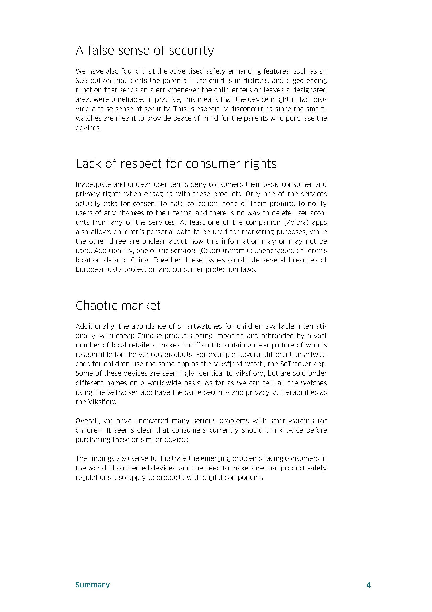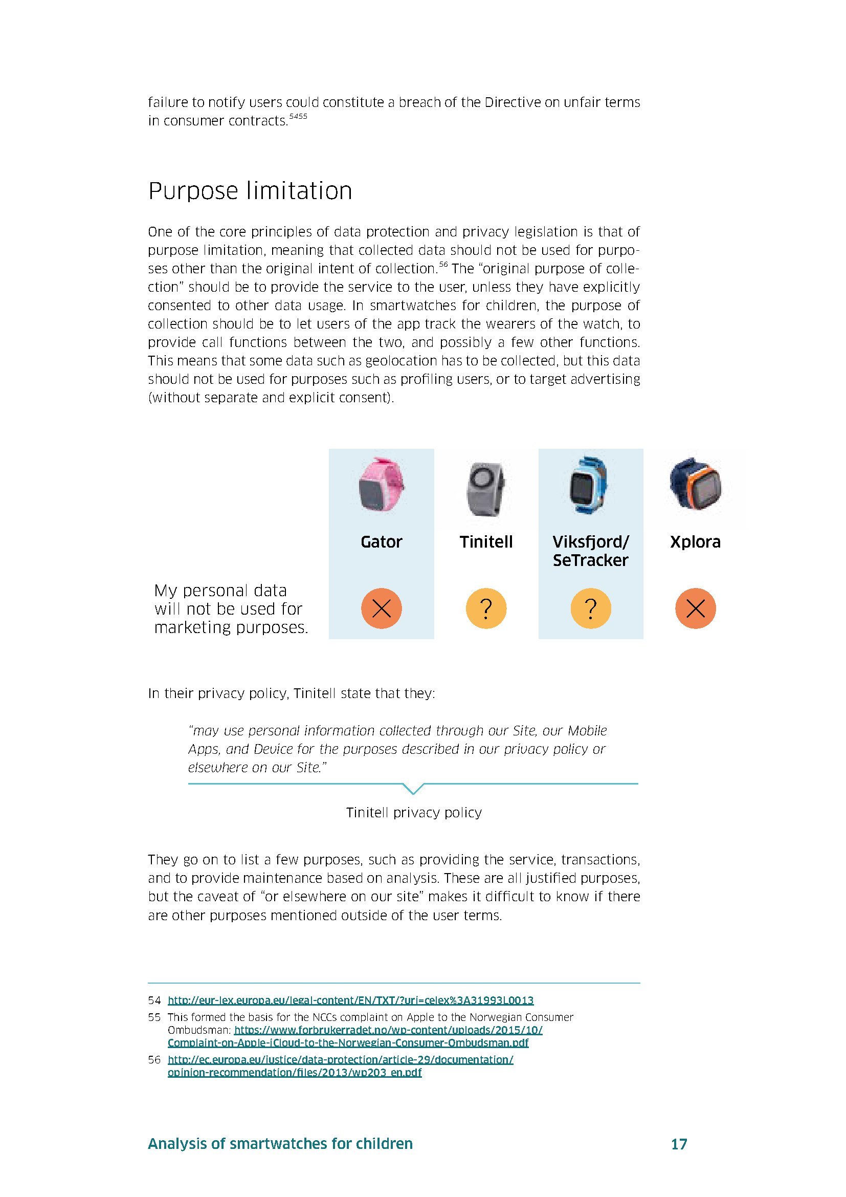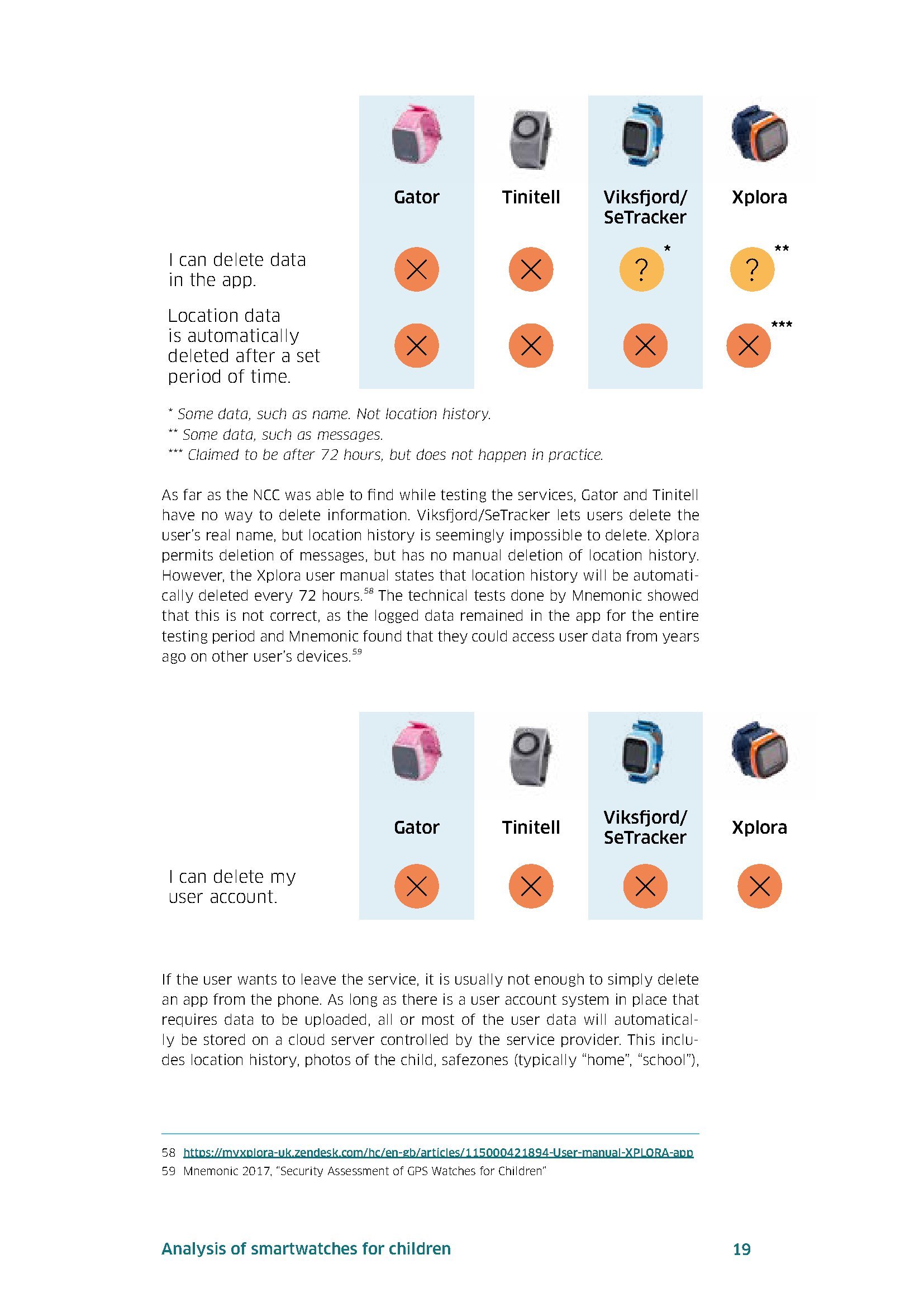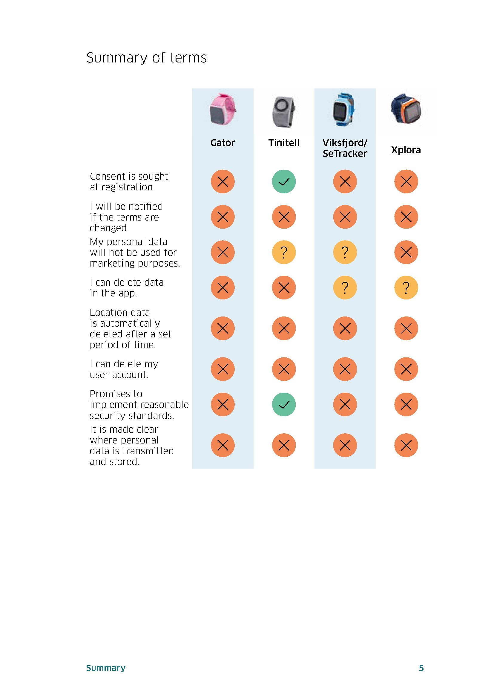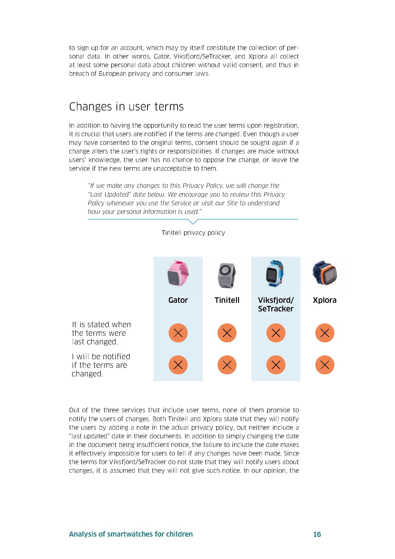 不足和不清楚的用户条款否认了消费者的基本权益,如隐私权。调查发现,只有一个服务在收集数据时征求同意,没有儿童智能手表承诺更改条款时予以告知,而且也无法从服务中删除用户帐户。Xplora上至少有一个应用允许将儿童个人数据用于营销目的。其他三个手表在如何使用儿童信息方面没有明确说明。