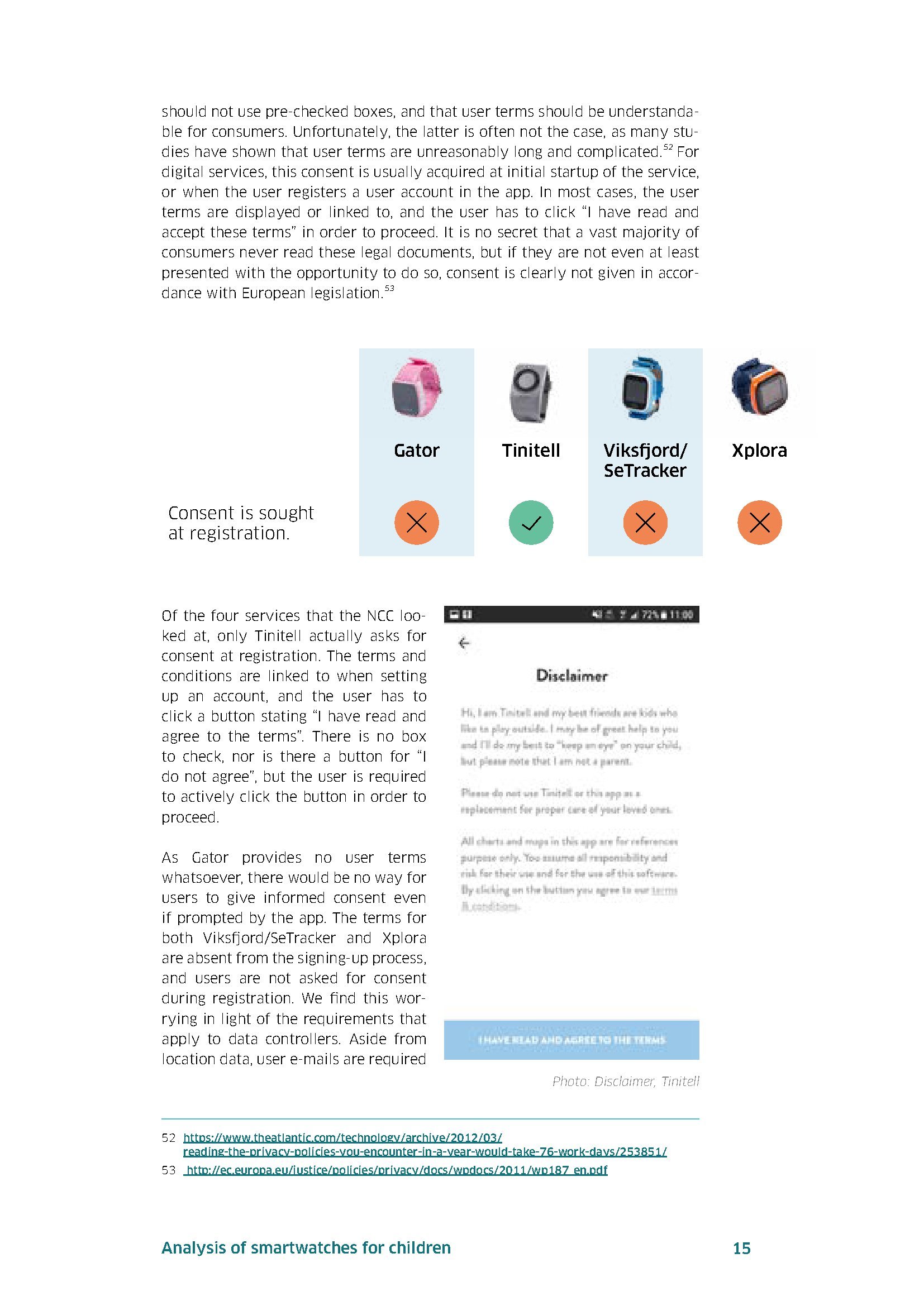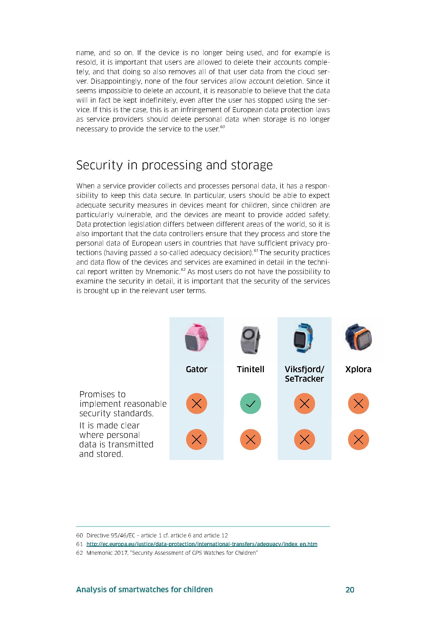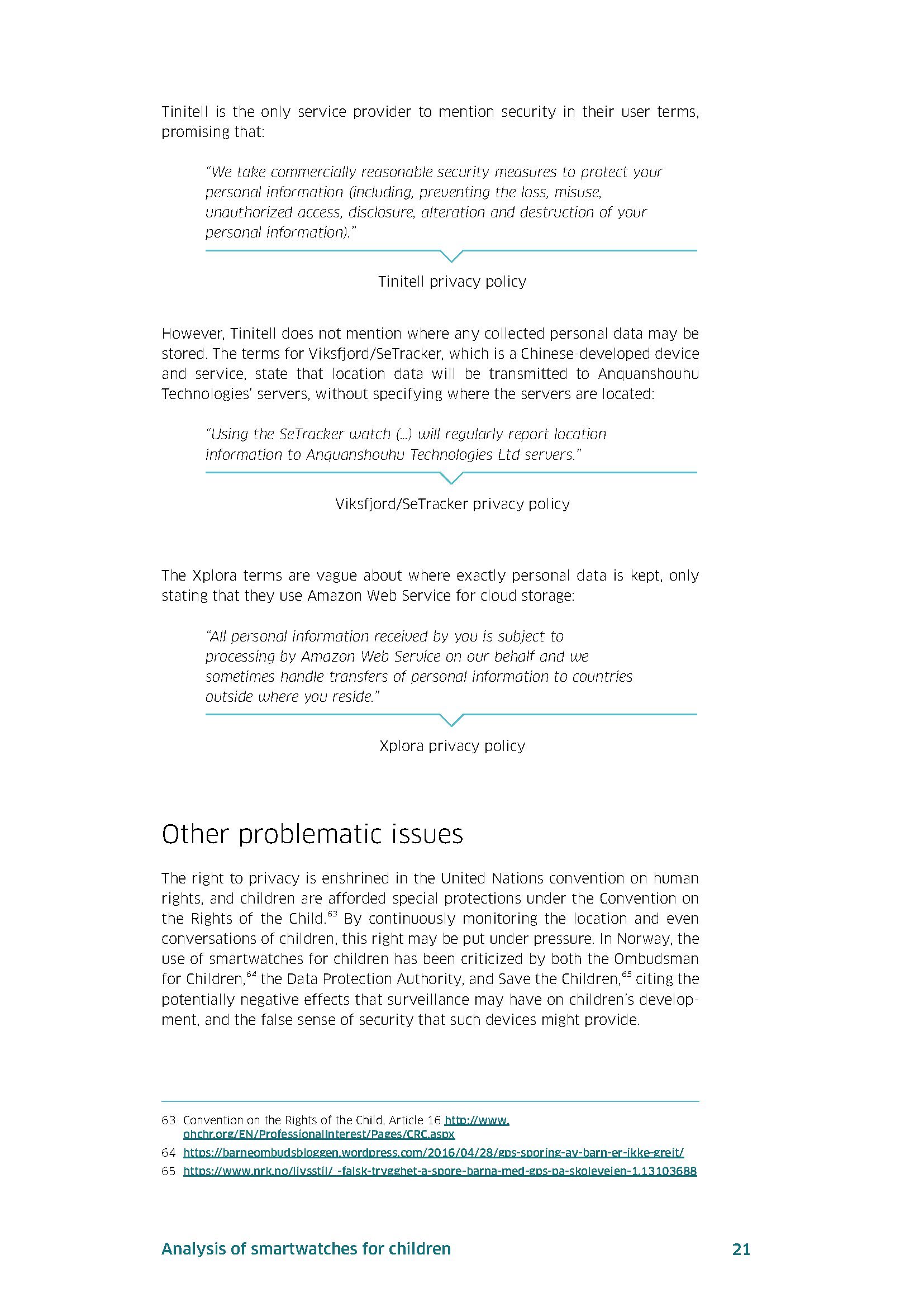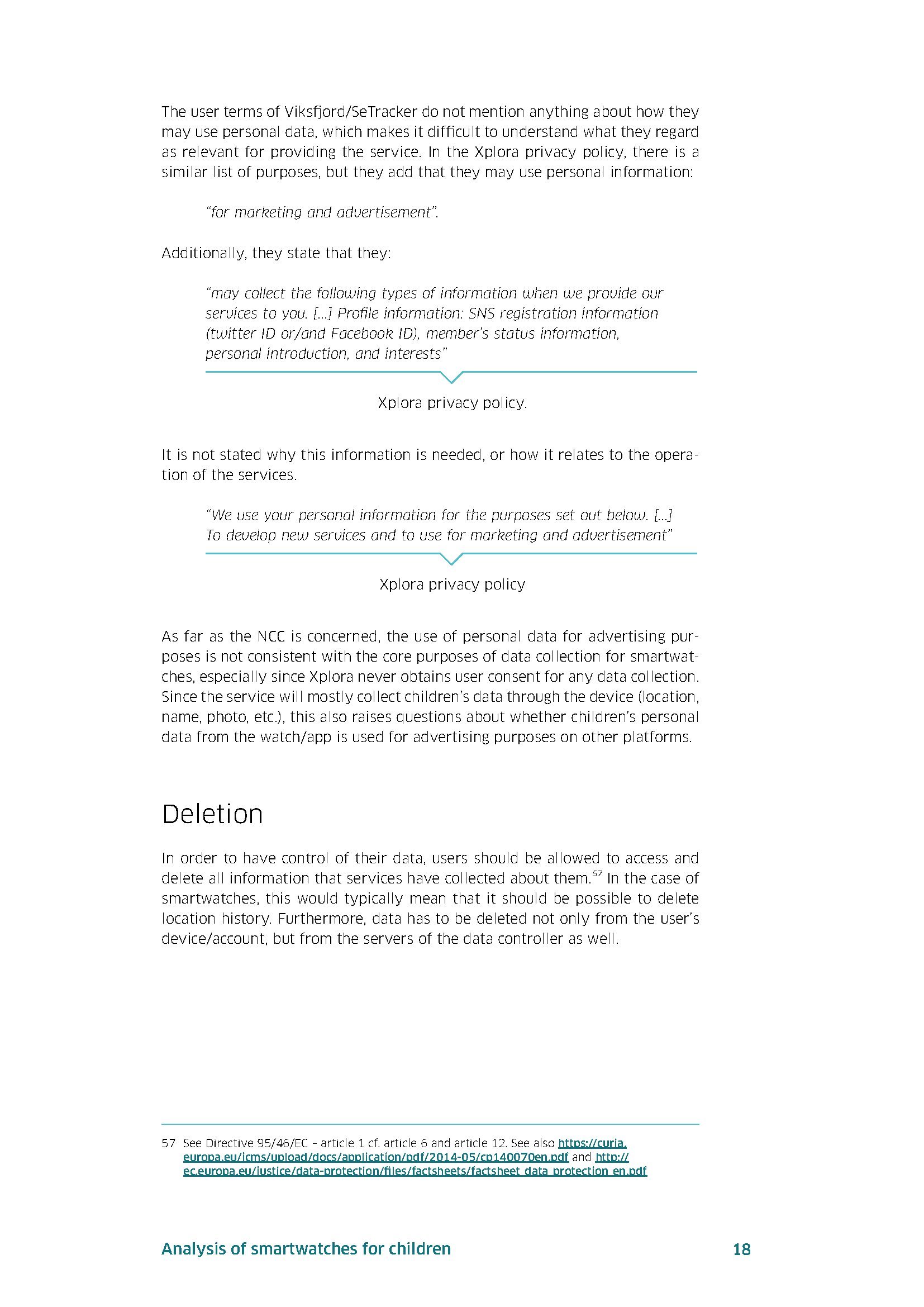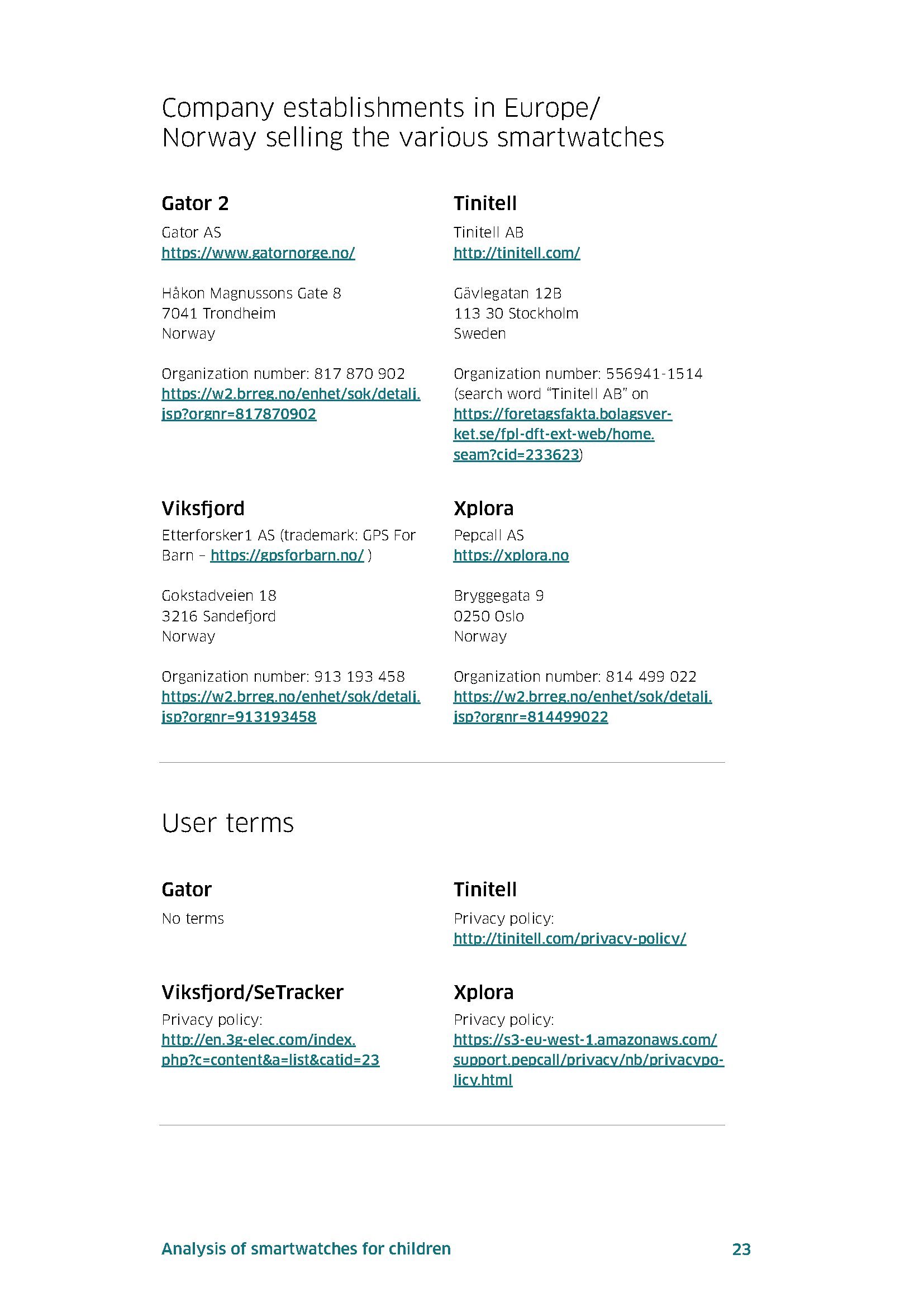 不足和不清楚的用户条款否认了消费者的基本权益,如隐私权。调查发现,只有一个服务在收集数据时征求同意,没有儿童智能手表承诺更改条款时予以告知,而且也无法从服务中删除用户帐户。Xplora上至少有一个应用允许将儿童个人数据用于营销目的。其他三个手表在如何使用儿童信息方面没有明确说明。