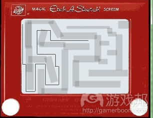 在70年代,我的一些玩具本身寿命并不长。我记忆犹新的一个“玩具游戏”是我和哥哥用神奇画板(游戏邦注:Etch-A-Sketch是一种儿童玩具,由一支笔和一个画板构成。笔尖有磁铁,可以在班上涂鸦;拉动板下的横条,板上图案即被擦掉)做的。神奇画板是一种糟糕的画图玩具,很难控制,但具备成为一款原始交互游戏的必要元素。我制作这个“游戏”时是8岁(1978年)。灵感源于我在街机上看到的赛车游戏《Grand Trak 10》和《Sprint》。