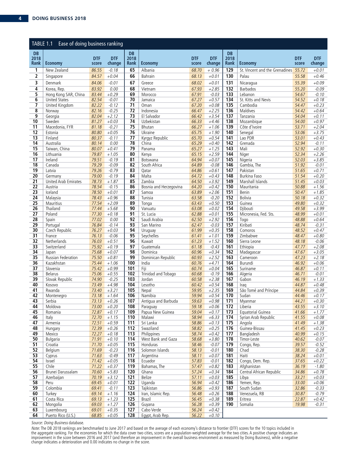 在营商环境年度排名上,新西兰、新加坡和丹麦保持第一、第二和第三的位置,之后为韩国、中国香港、美国、英国、挪威、格鲁吉亚和瑞典。