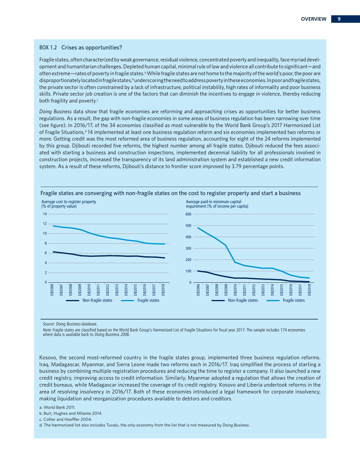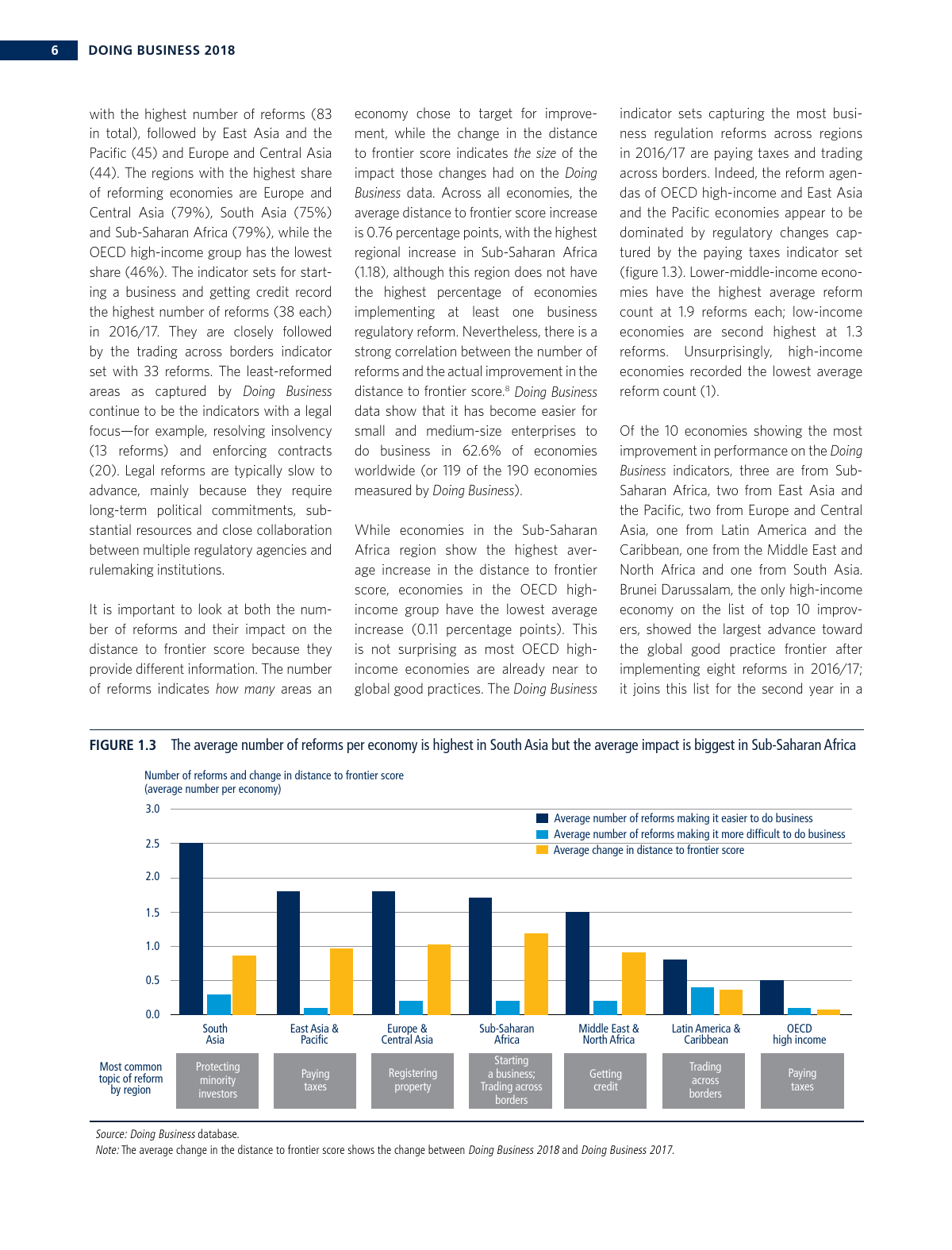 发展中经济体共实施改革206项,占改革总数的78%,其中撒哈拉以南非洲实施改革83项,连续两年破纪录,南亚实施改革20项亦破纪录。大量的改革集中在获取信贷和注册新企业的改善上,各有38项改革。跨境贸易便利化有33项改革。