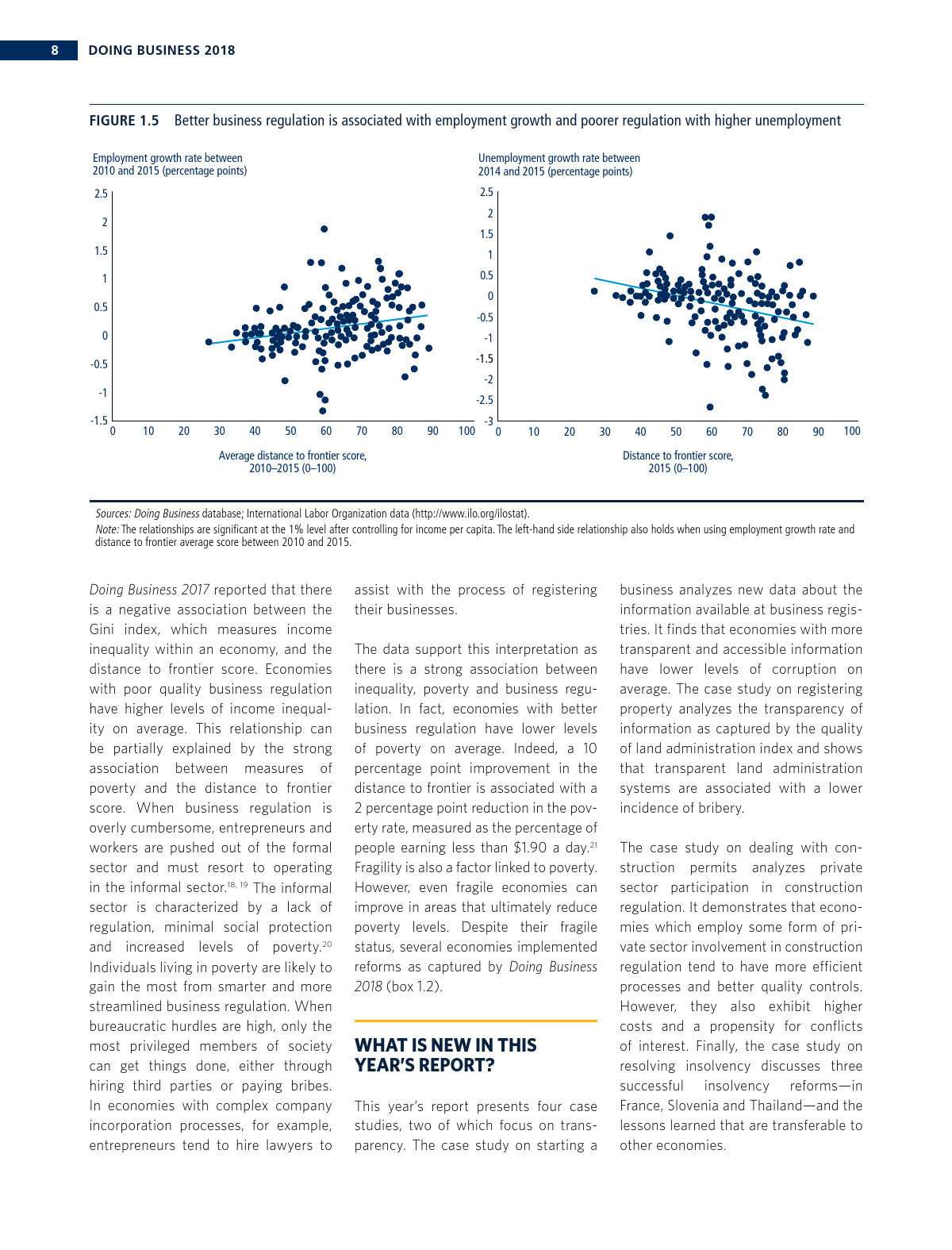 今年的报告包括两个透明度案例,这两个案例通过分析来自企业注册局和土地管理局的数据,发现信息比较公开透明的经济体腐败和贿赂程度也比较低。第三个案例是关于私营部门参与制定建筑条例的,该案例发现此类条例显示成本较高并具有利益冲突倾向。第四个案例介绍了法国、斯洛文尼亚和泰国的三项成功的破产改革及其可供其他经济体借鉴的经验。