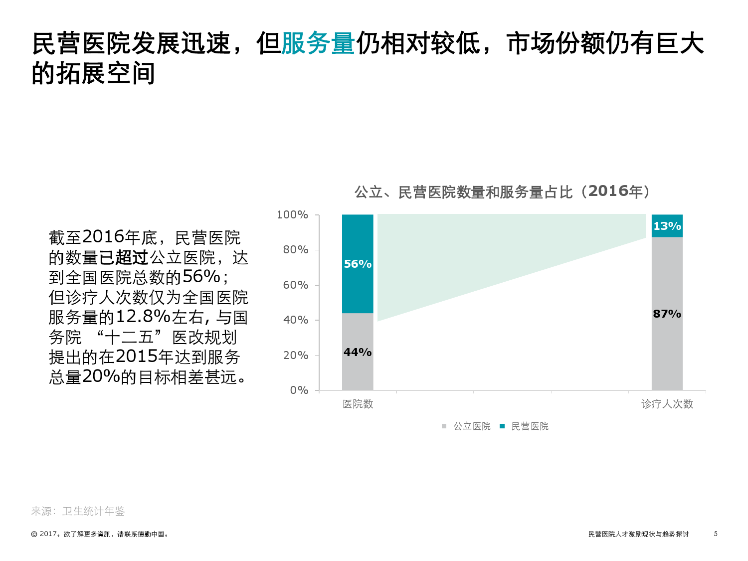 随着“健康中国”国家战略的确立,医疗服务产业迎来了新一轮发展契机。近年来,政策层面持续释放利好,鼓励社会力量进入医疗服务领域,为民营医院的蓬勃发展提供了良好的外部环境。截至2016年底,我国民营医院数量达到全国医院总数的56%,但诊疗人次数仅为全国医院服务量的12.8%左右,与国务院 “十二五”医改规划提出的在2015年达到服务总量20%的目标相差甚远,可见民营医院仍有巨大的发展空间。