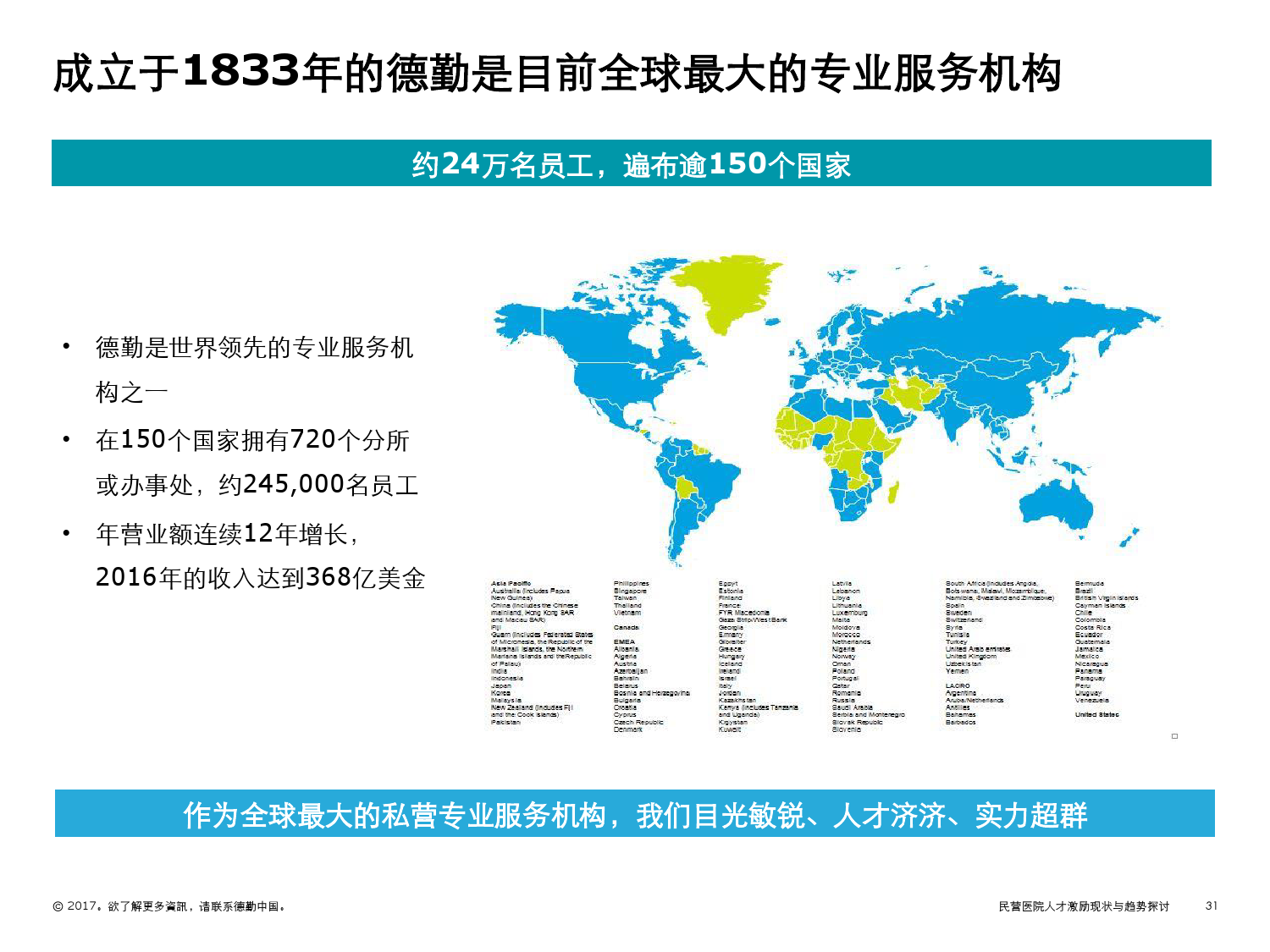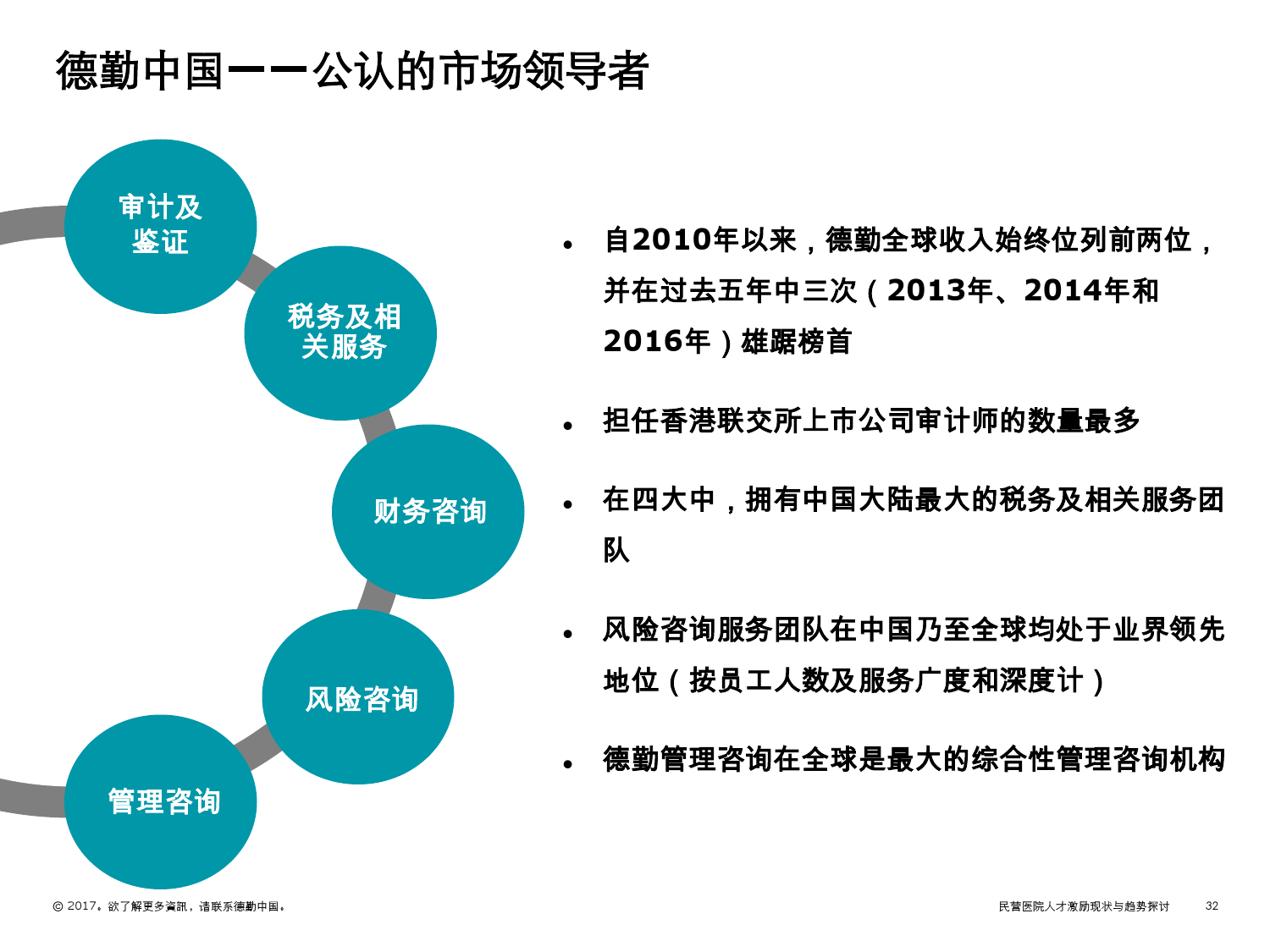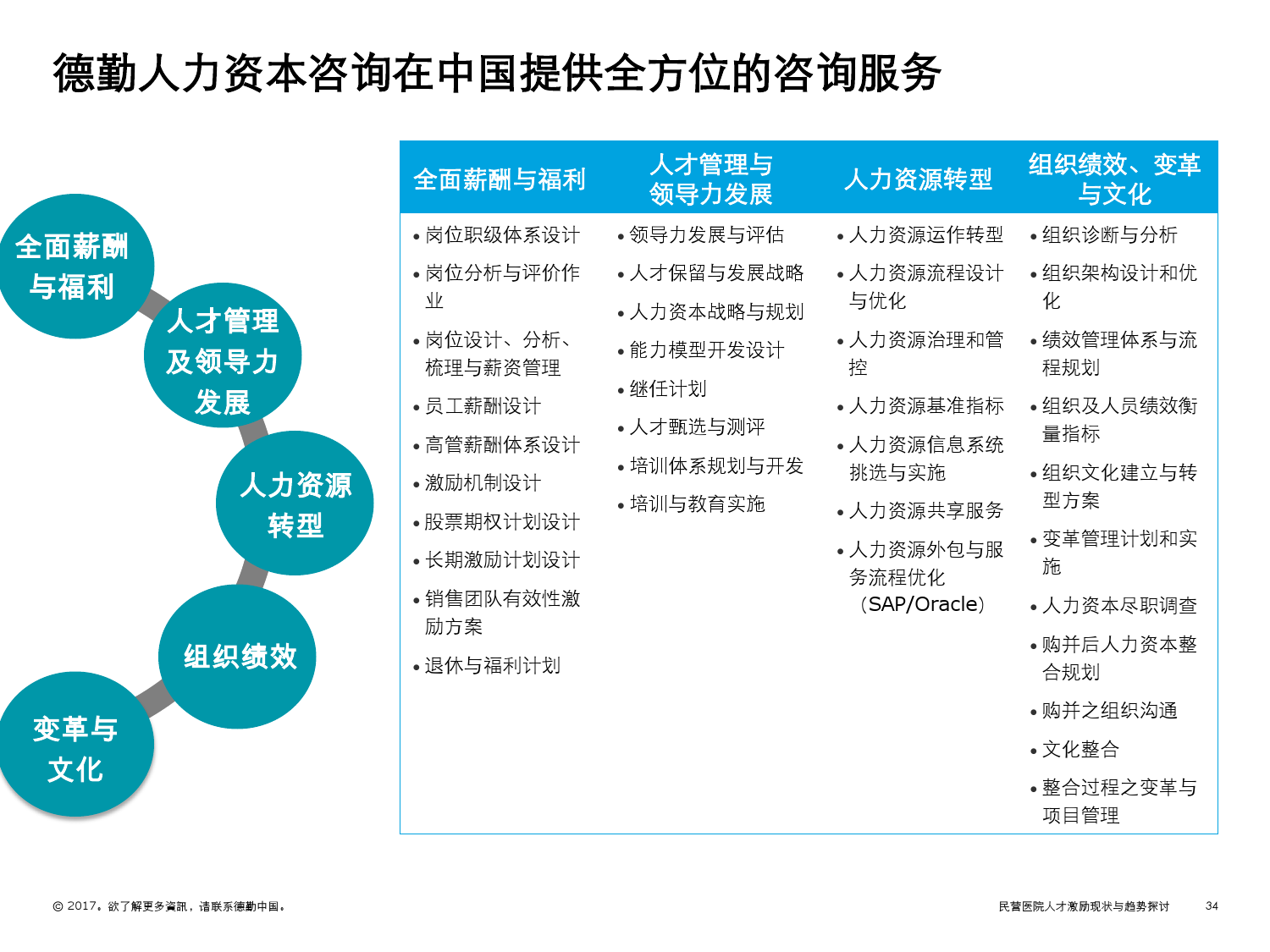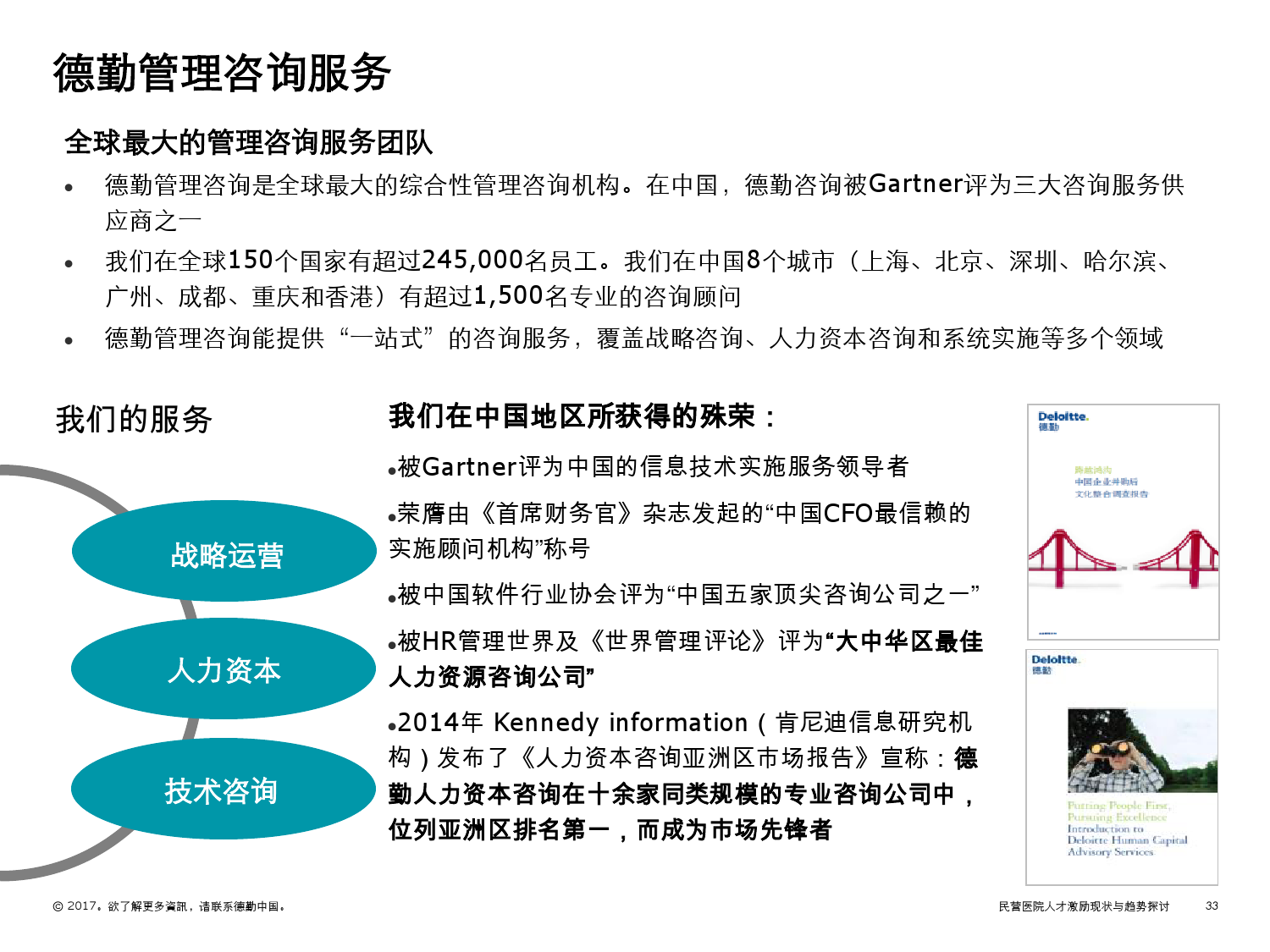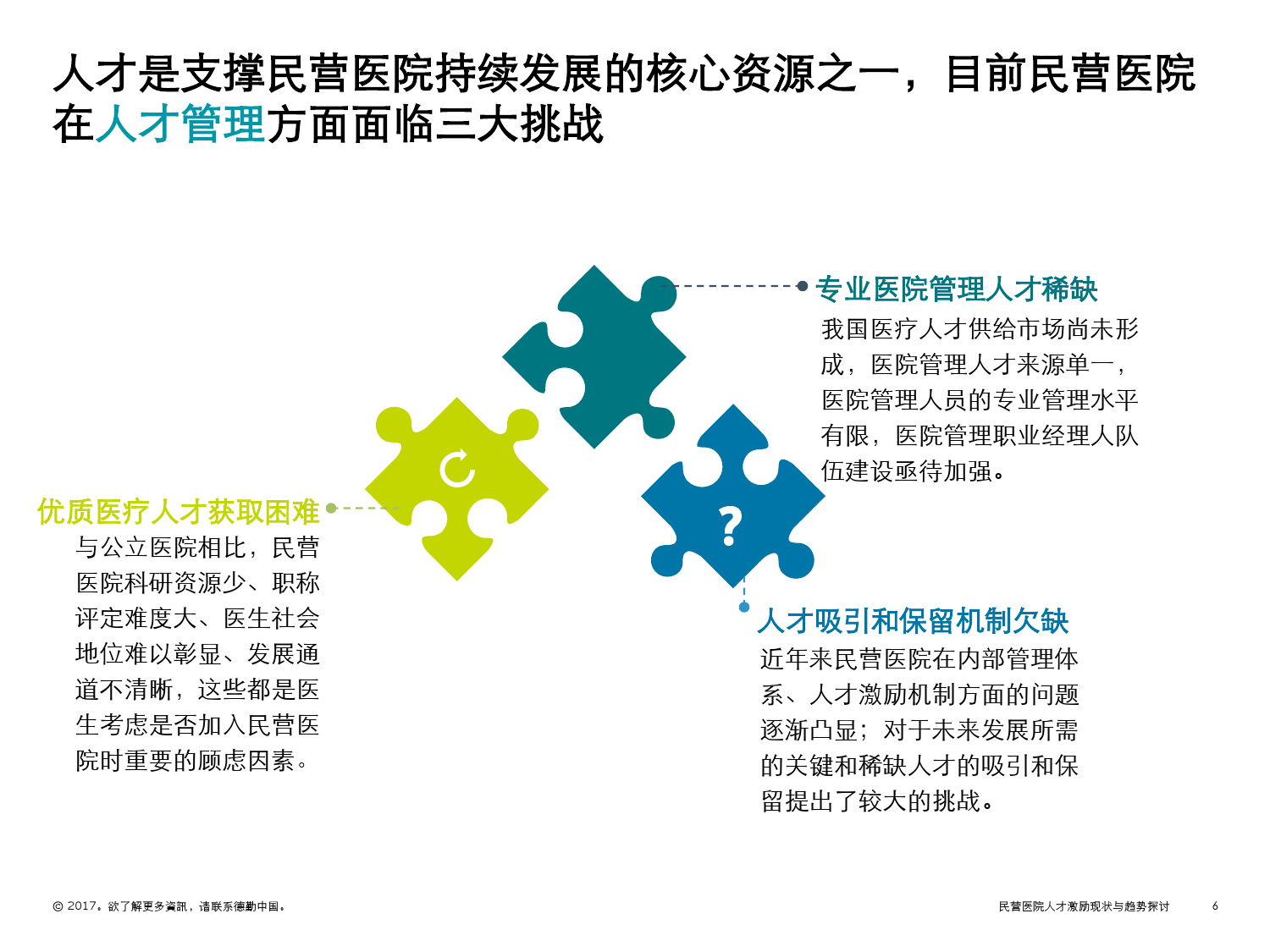 德勤人力资本团队总结大量民营医院服务经验,提出人才是支撑民营医院持续发展的核心资源之一,并总结了民营医院在人才管理方面面临三大挑战,包括优质医疗人才获取困难、专业医院管理人才稀缺以及人才吸引和保留机制欠缺。