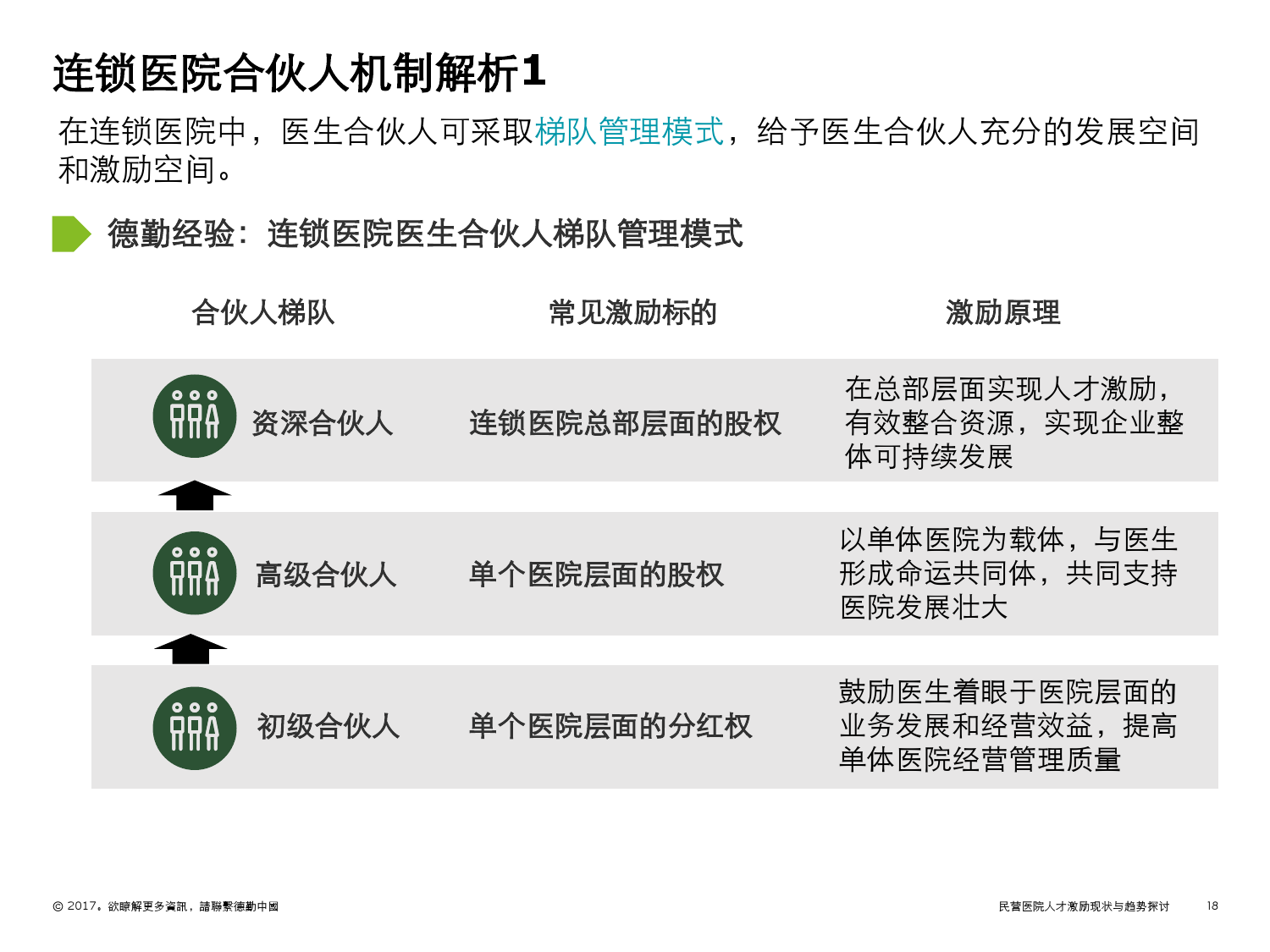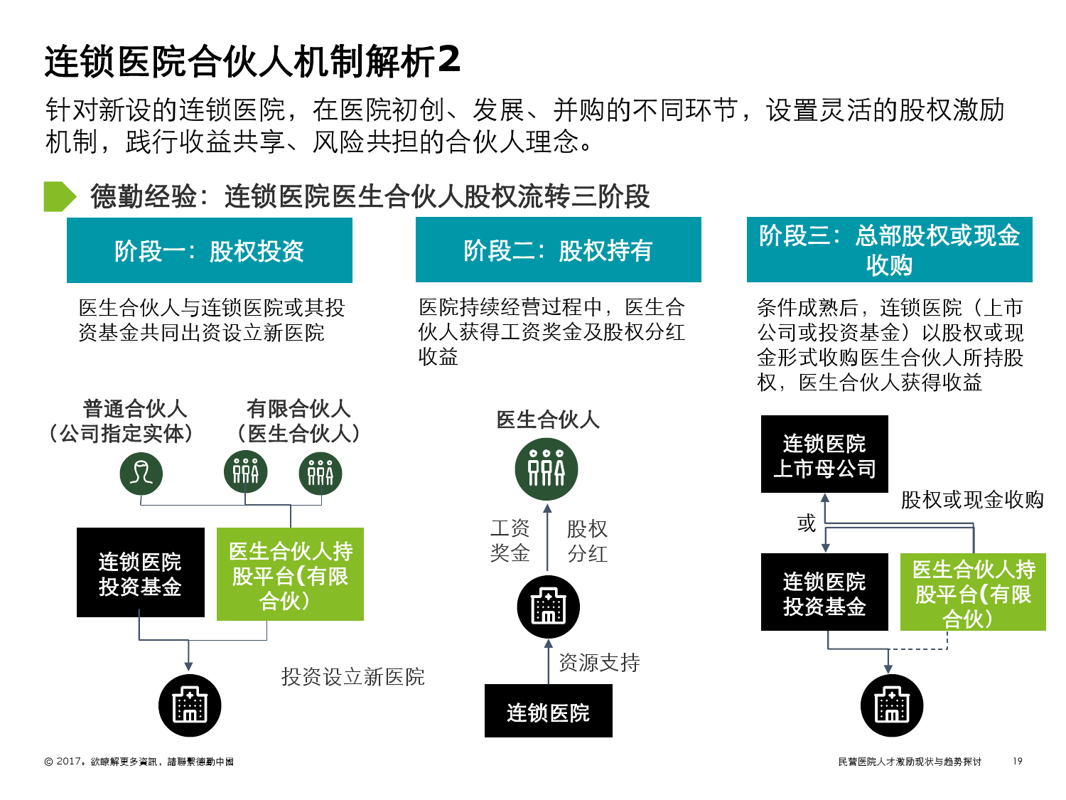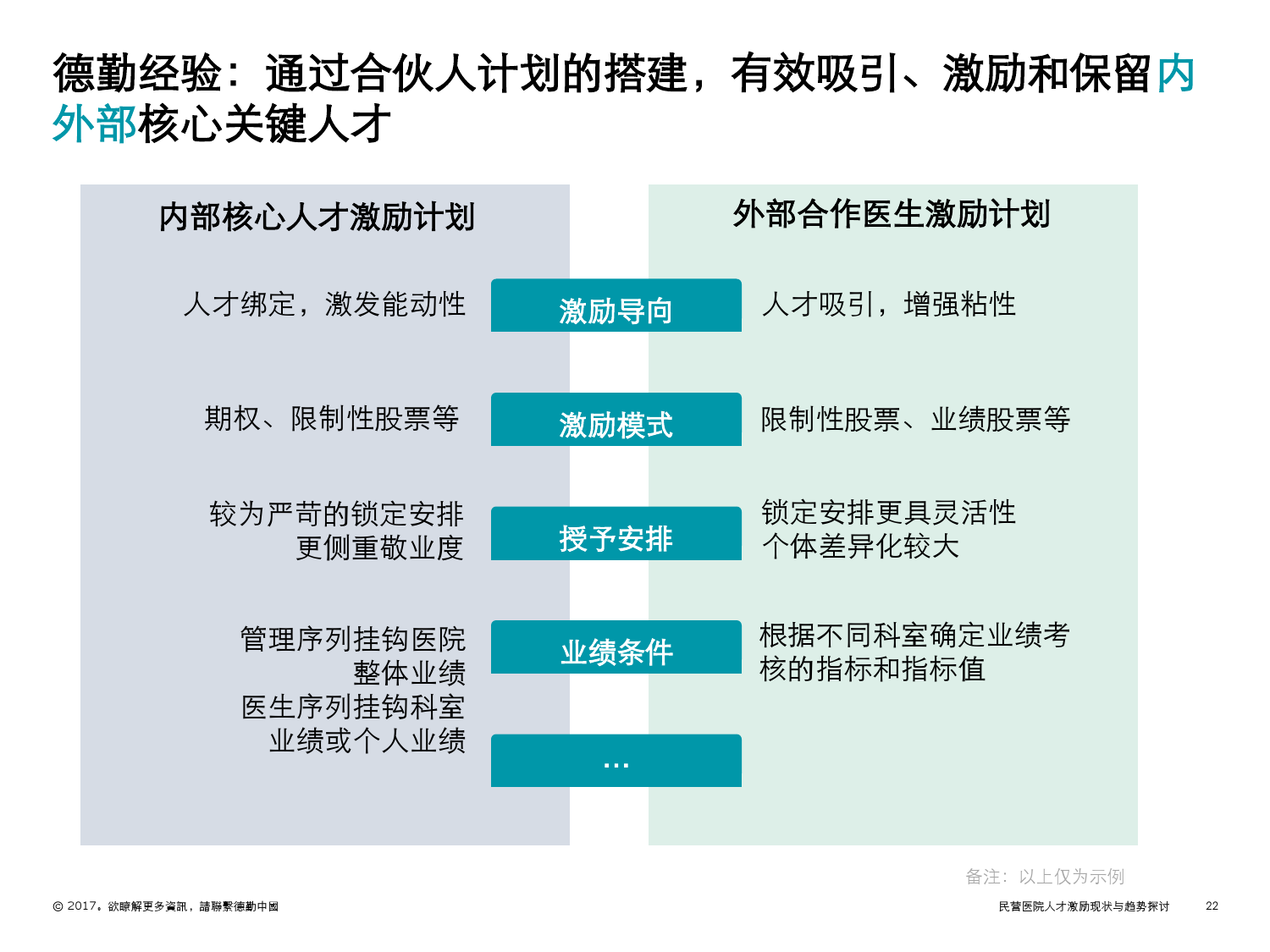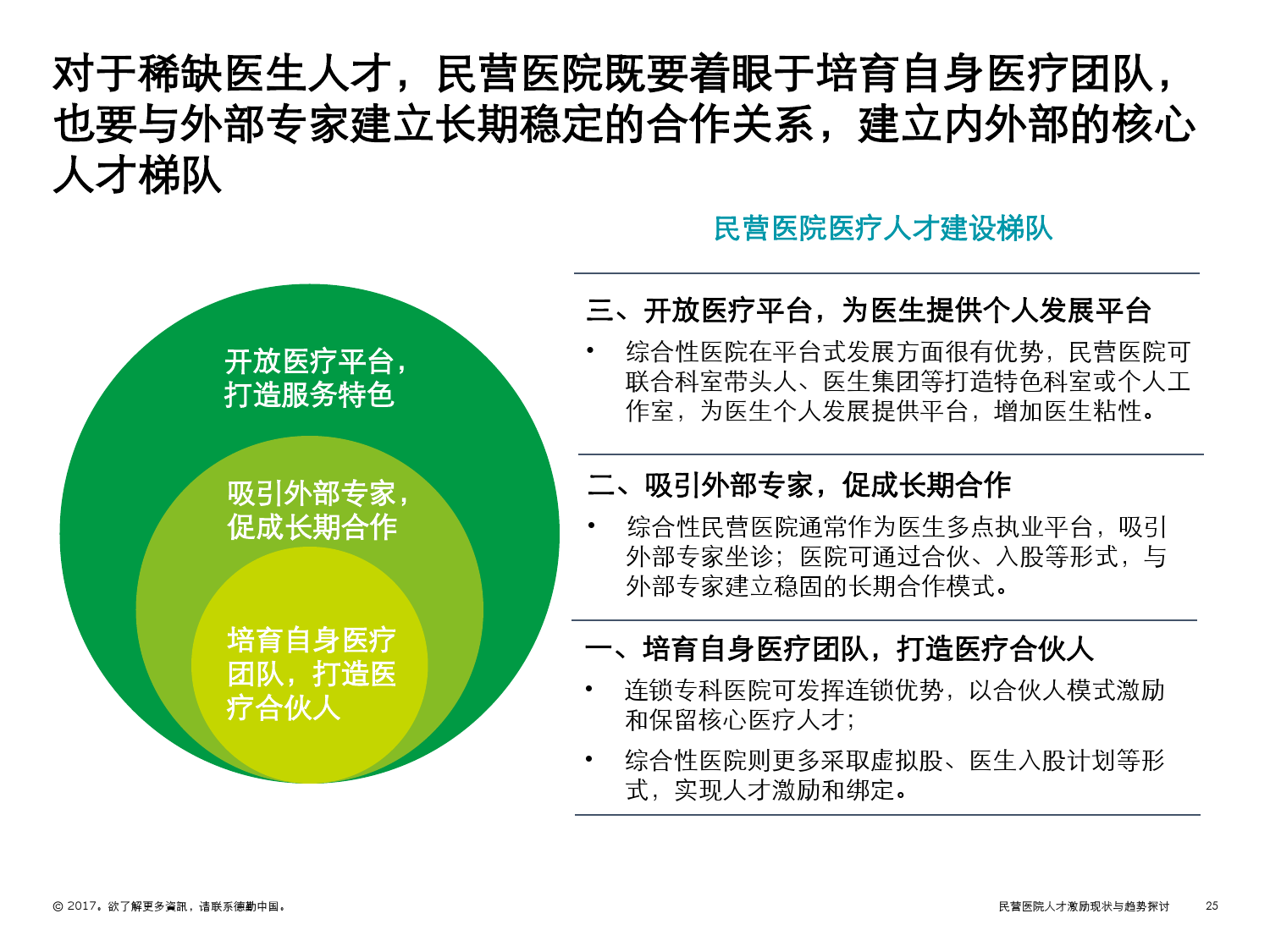 德勤认为,民营医院发展主要依靠两类核心人才:专业医院管理人才和稀缺医生人才。对于专业医院管理人才,民营医院可通过市场化激励机制和职业经理人机制实现人才吸引和保留。对于稀缺医生人才,民营医院既要着眼于培育自身医疗团队,例如连锁专科医院可发挥连锁优势,以合伙人模式激励和保留核心医疗人才;又要与外部专家建立长期合作关系,通过合伙、入股等形式,绑定外部专家,并为专家及其团队提供发展平台,增加医生粘性。