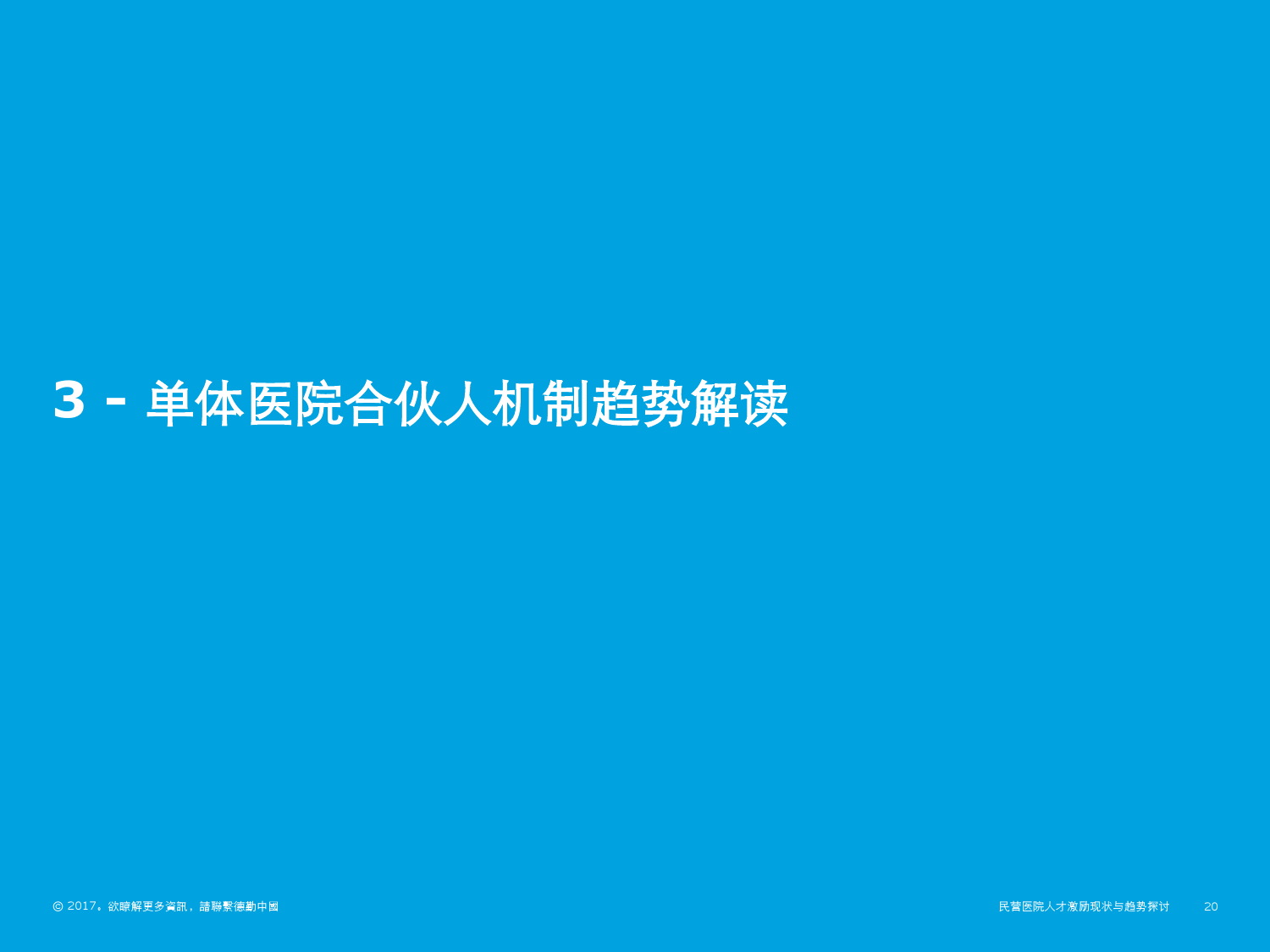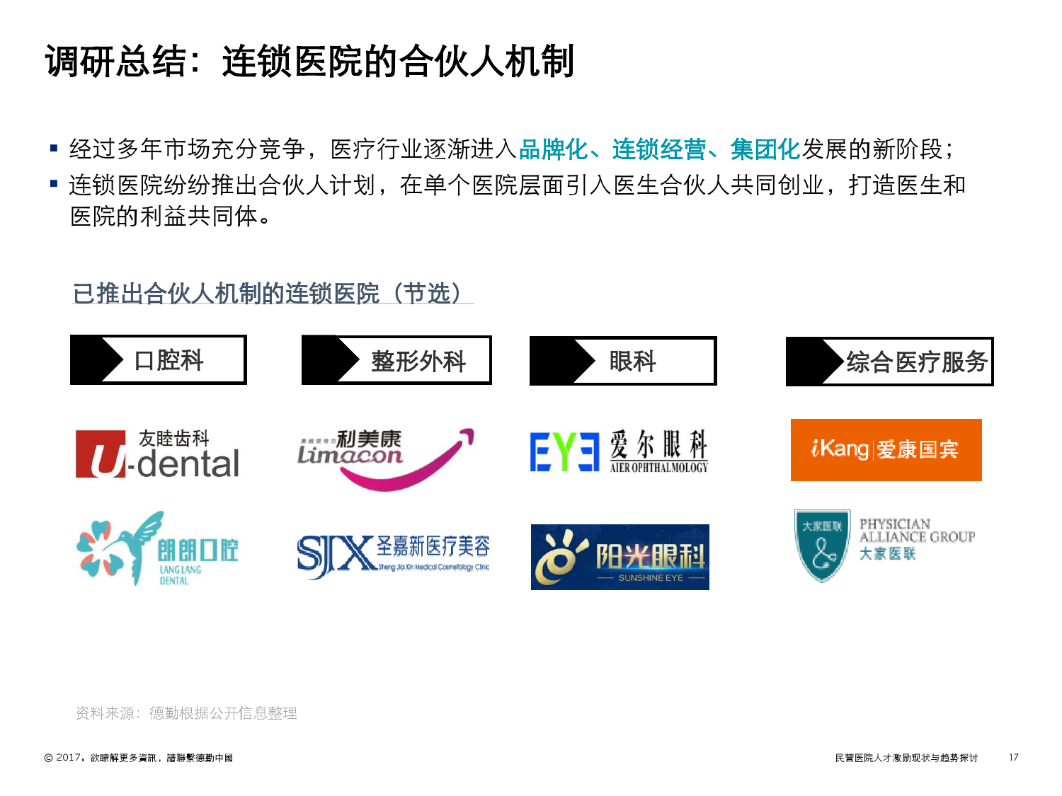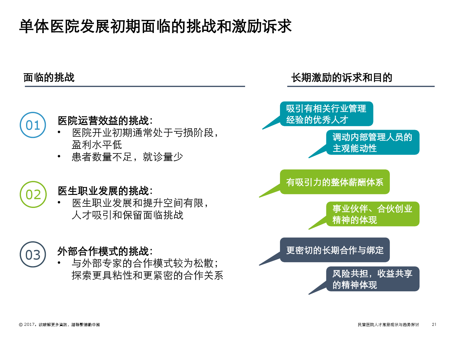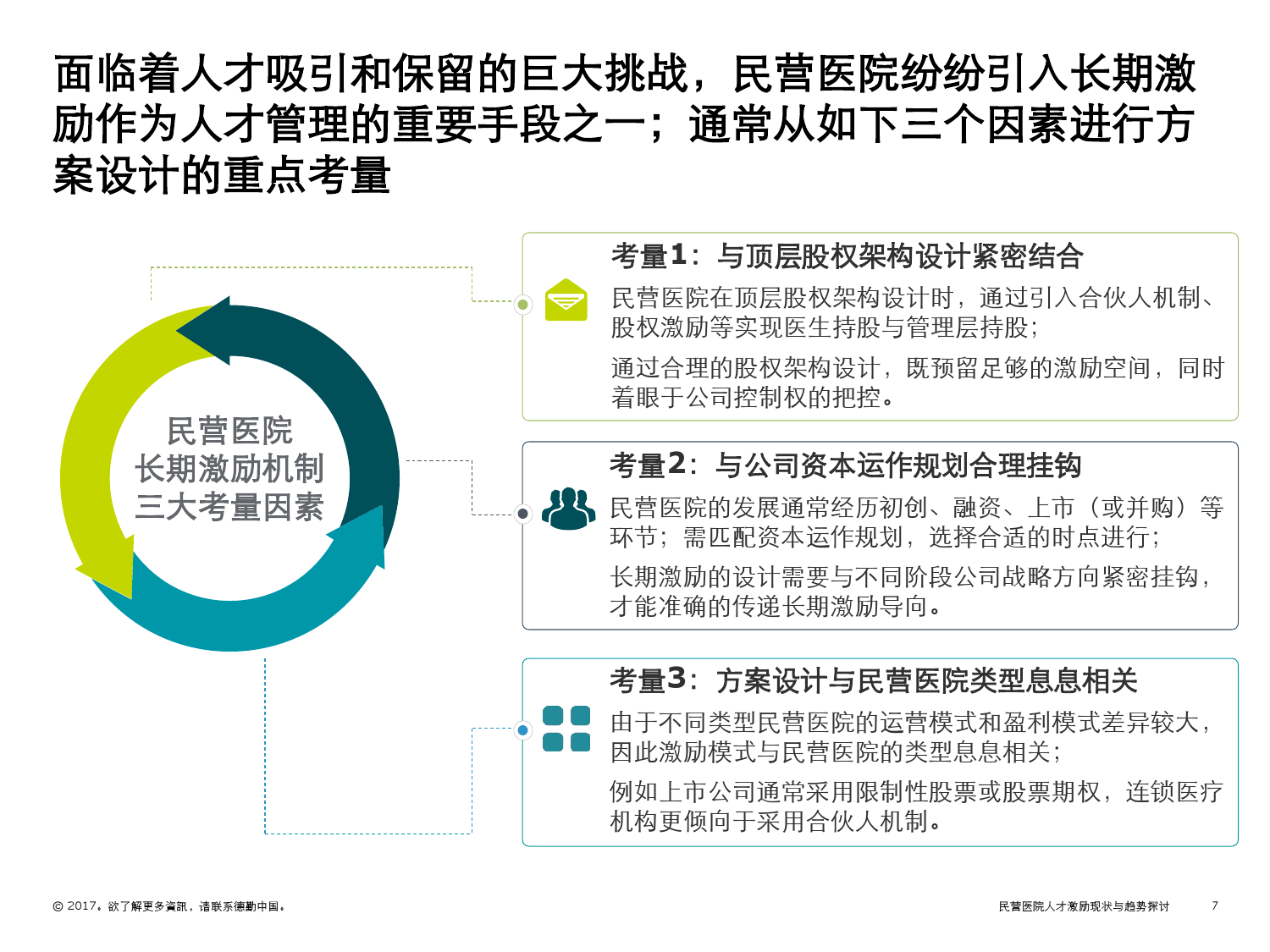 德勤认为,民营医院发展主要依靠两类核心人才:专业医院管理人才和稀缺医生人才。对于专业医院管理人才,民营医院可通过市场化激励机制和职业经理人机制实现人才吸引和保留。对于稀缺医生人才,民营医院既要着眼于培育自身医疗团队,例如连锁专科医院可发挥连锁优势,以合伙人模式激励和保留核心医疗人才;又要与外部专家建立长期合作关系,通过合伙、入股等形式,绑定外部专家,并为专家及其团队提供发展平台,增加医生粘性。