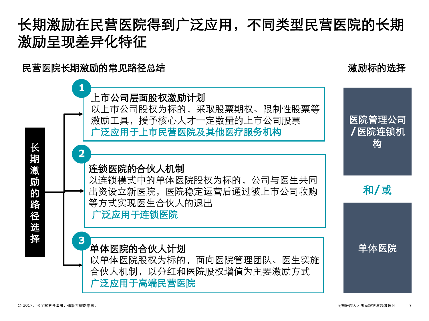 为应对上述挑战,民营医院挖掘自身优势,利用相对灵活的体制机制实施激励,与公立医院展开人才争夺战。长期激励作为人才保留和激励的重要手段,在民营医院得到广泛应用。德勤就民营医院长期激励现状开展了全面调研,总结了三条民营医院在长期激励领域的常见路径: