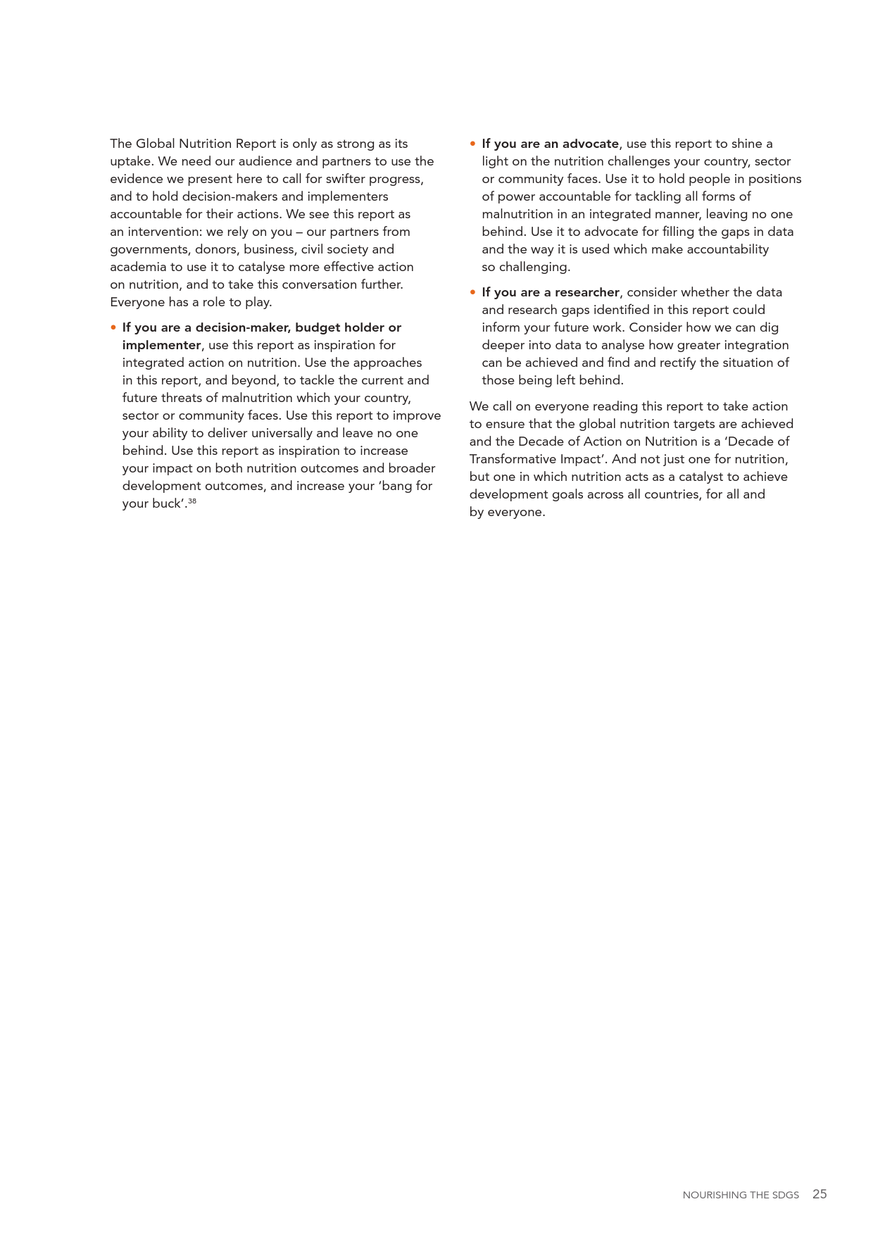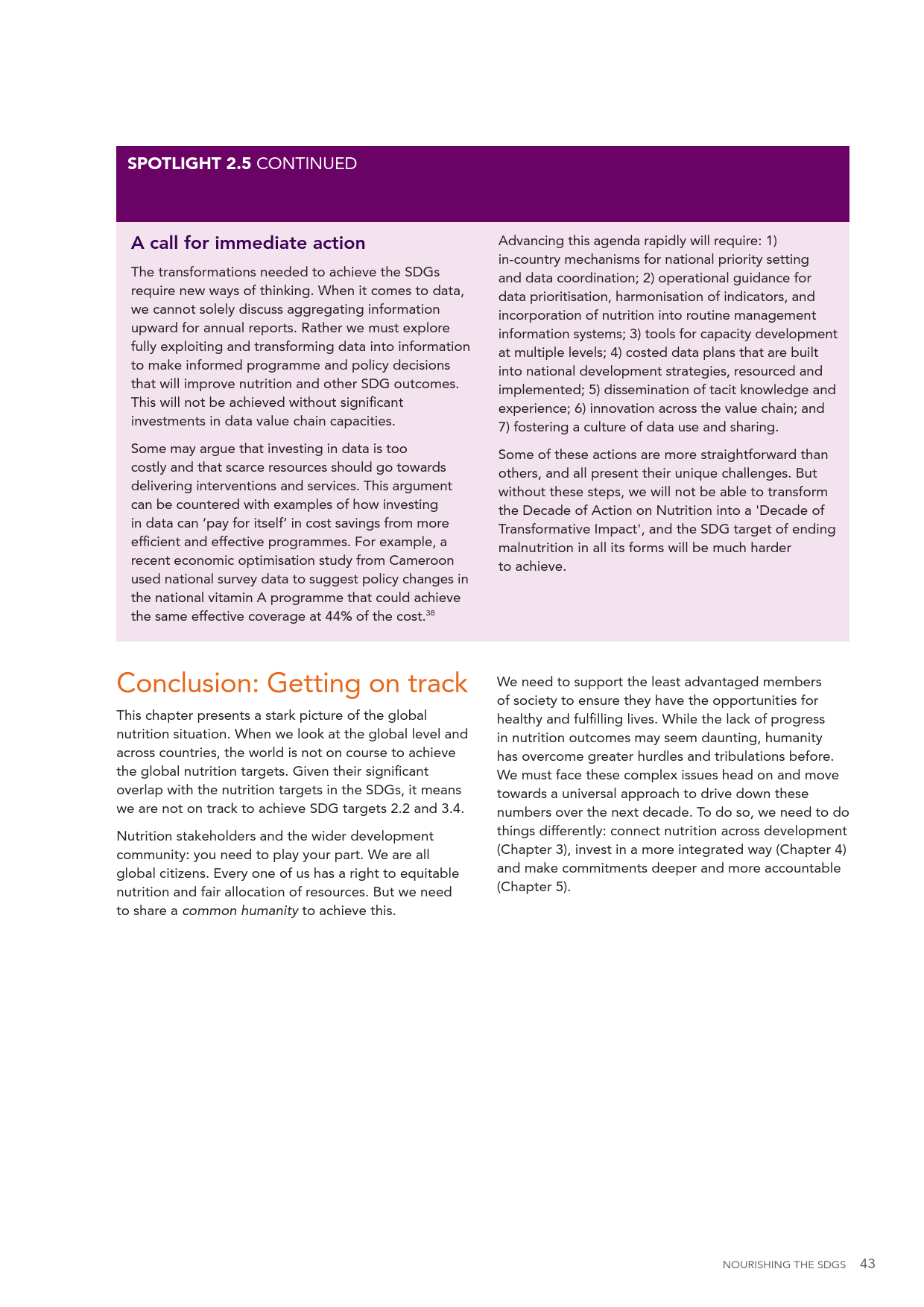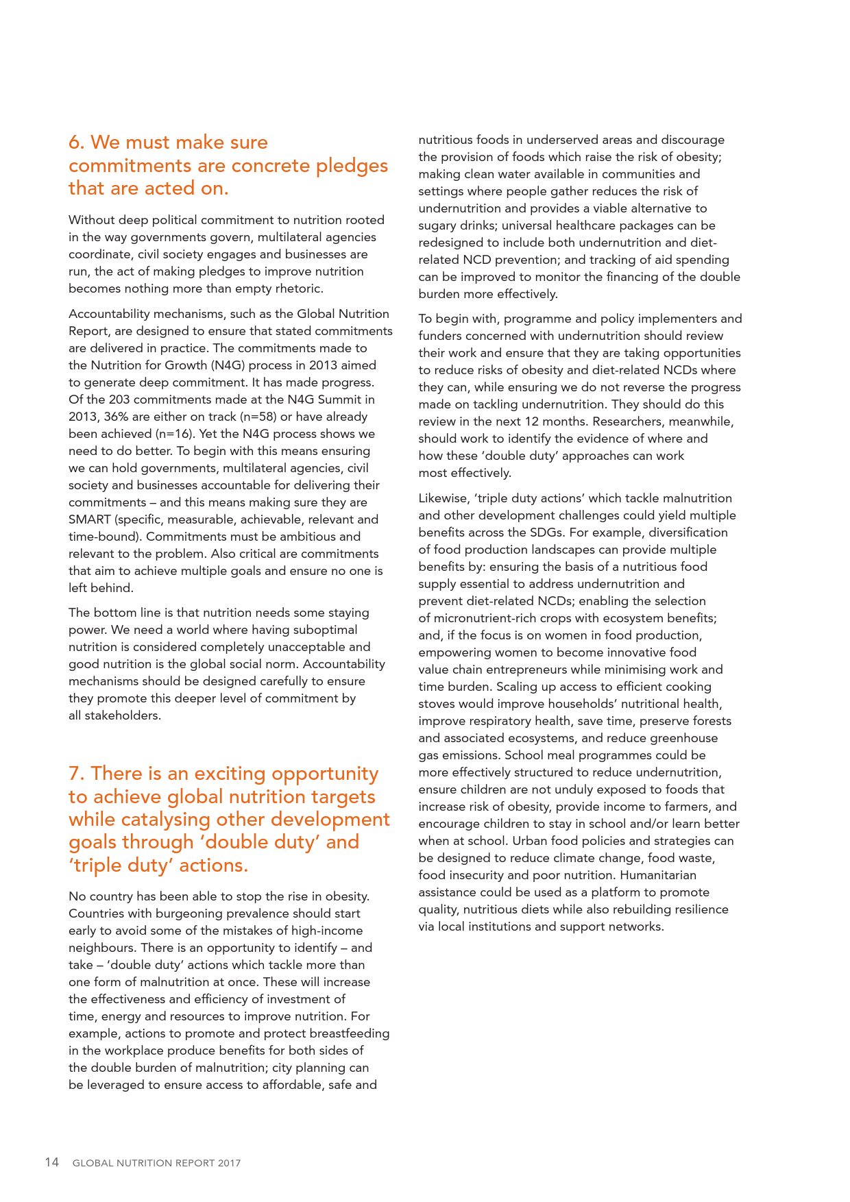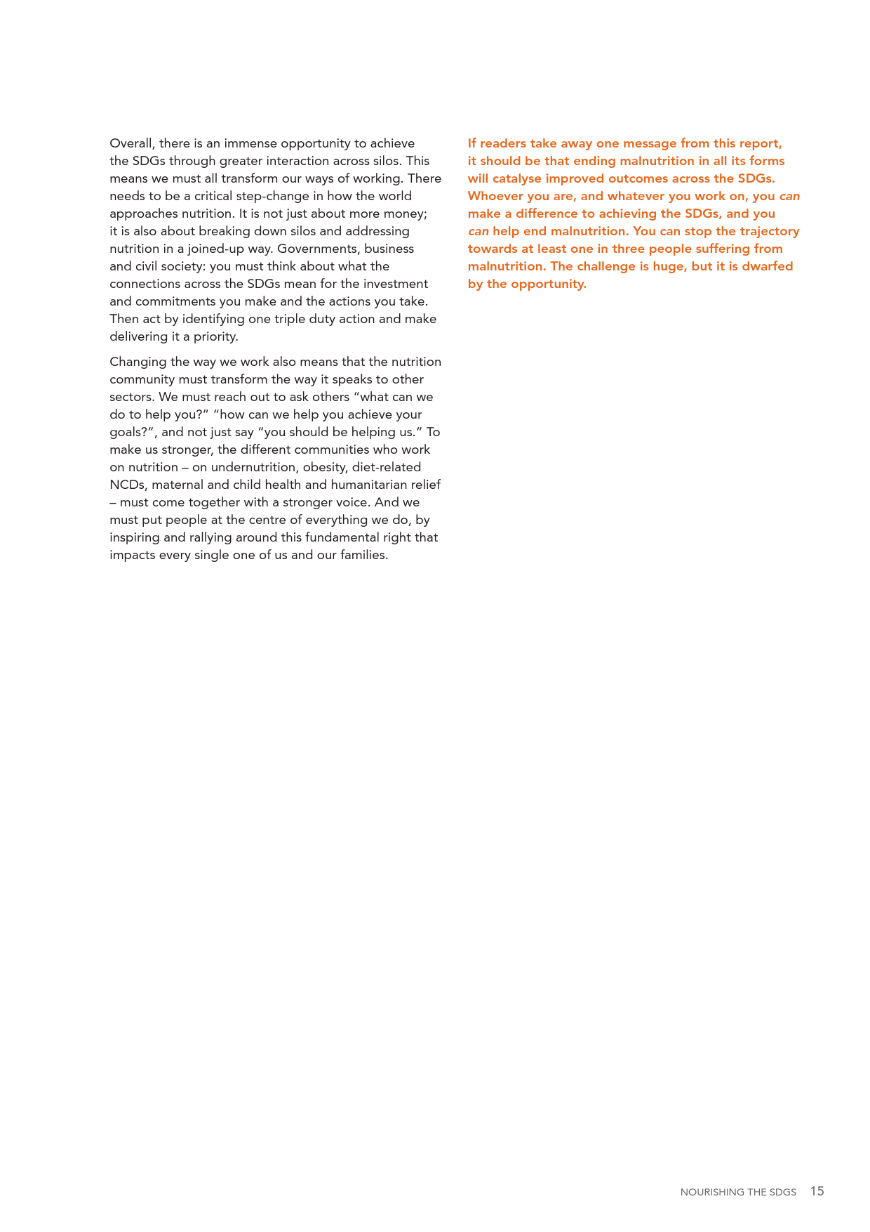 专家们呼吁各国政府行动起来,拿出三倍于目前的财政支持来解决饮食问题。2015年,这一经费增加了百分之二,达致8亿6千万美元,但是专家们认为经费至少要翻三倍,才能在未来10年达到700亿美元的目标。